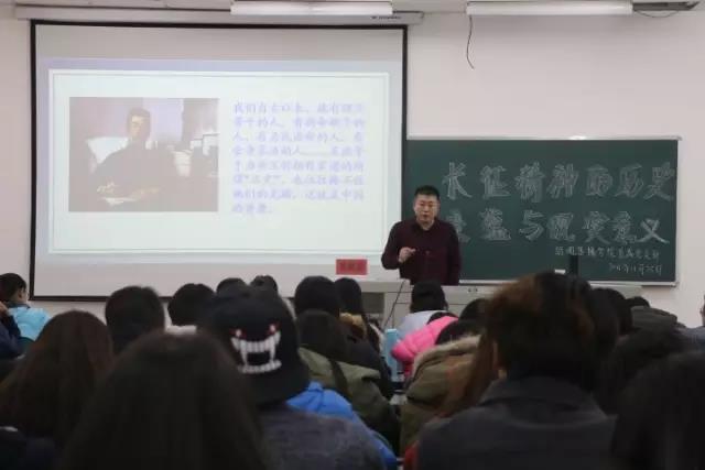 范映渊教授以"长征精神的历史意蕴与现实意义"为主题,慷慨激昂的解读了长征精神,无数革命故事信手拈来,将同学们带入了二万五千里长征的历史记忆中。他说:“不忘初心,继续前进是长征最直接、最现实的意义,祖国的发展离不开青年的觉悟,青年的发展离不开祖国的强大”。讲到叙利亚撤侨事件时,范映渊教授激情澎湃,语气中是满满的民族自豪感,他指出中国在强大,而我们的使命是让中国变得强大。范教授鼓励同学们,新青年生命取向要高,生命体验要深,生命能量要强。