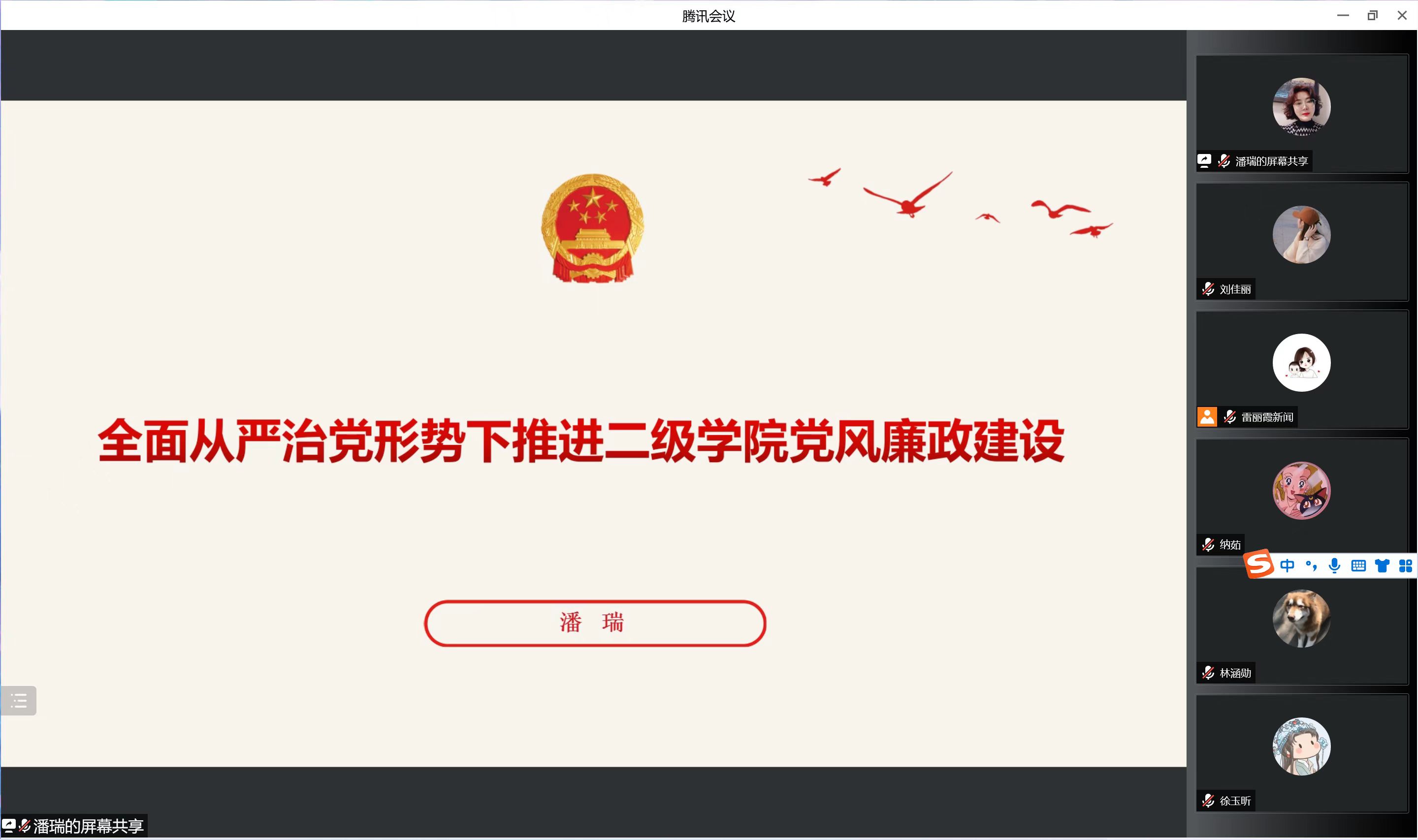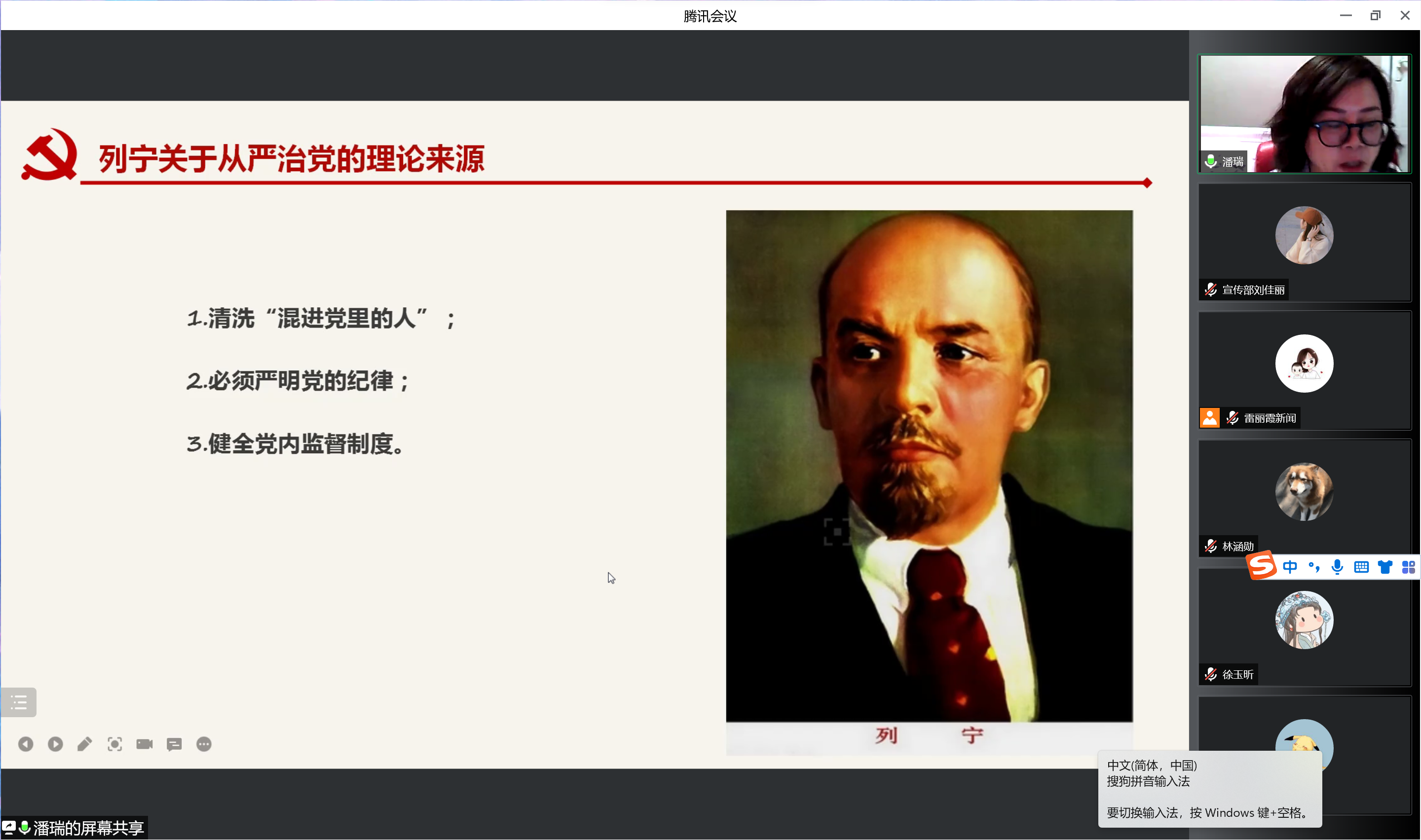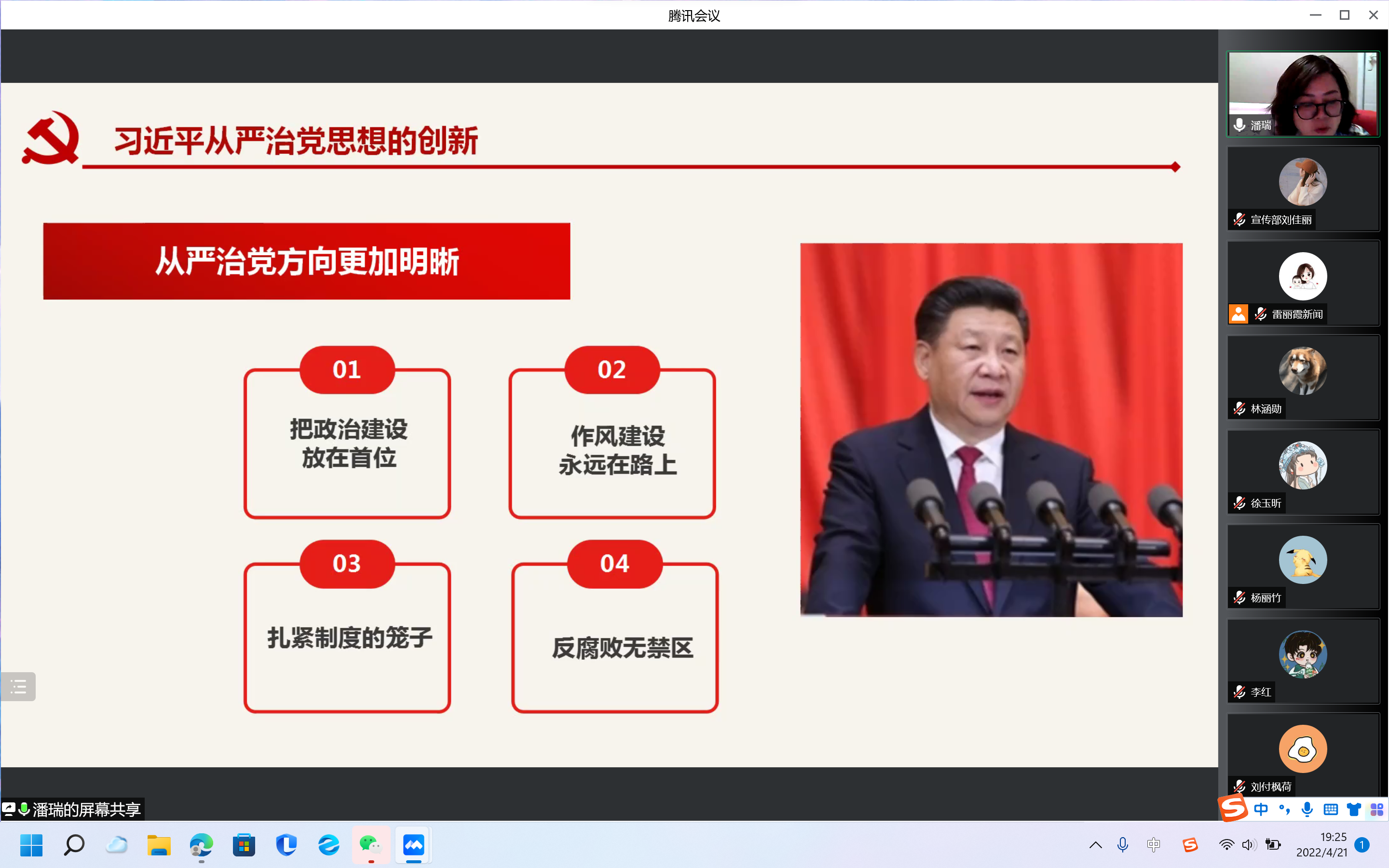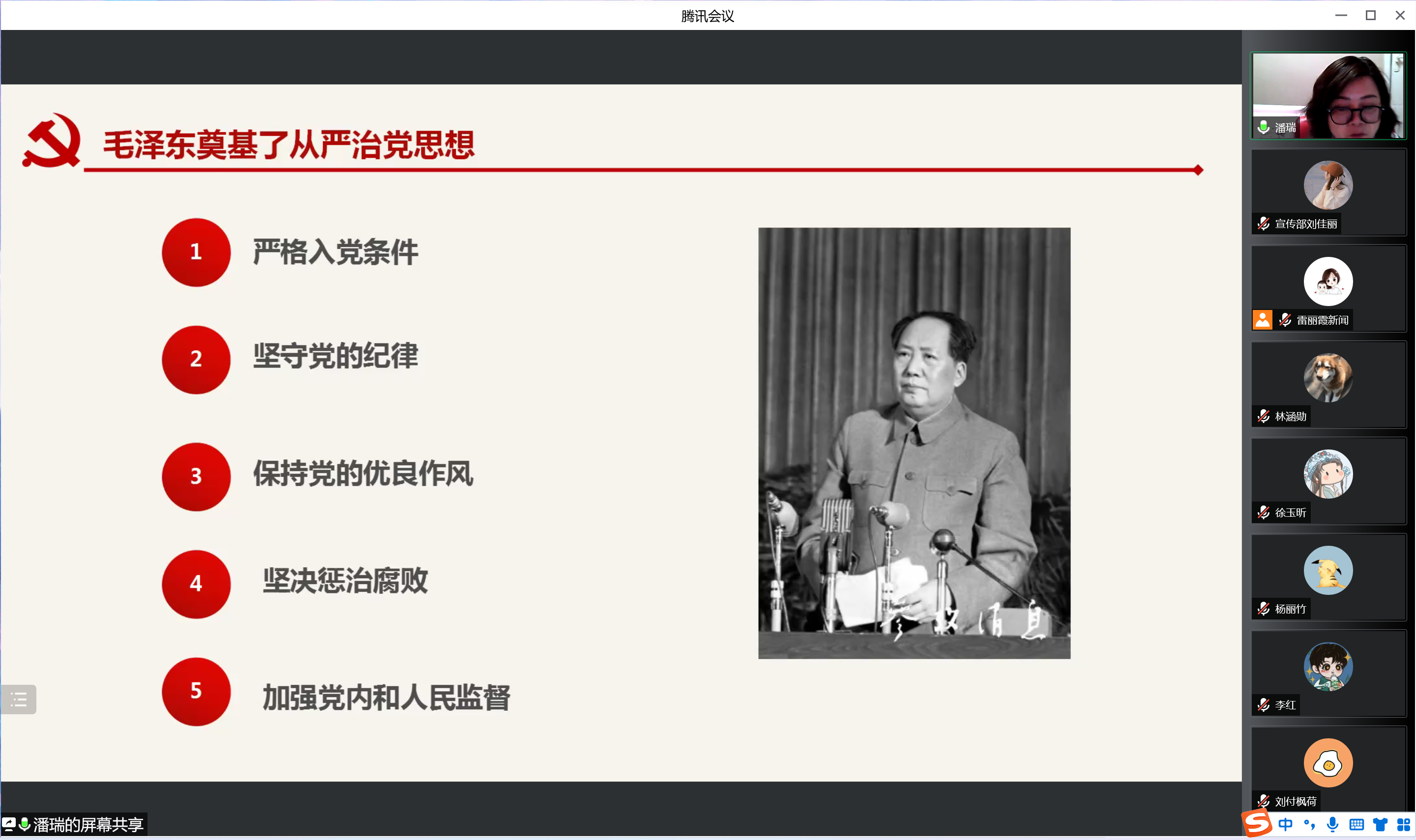会议伊始,潘瑞详细梳理了我党从严治党的理论来源和历史发展。她谈到,马克思列宁主义党建学说是我党从严治党的理论基础,从毛泽东同志奠定从严治党思想的基础开始,经过我党历代领导人将其不断发展、丰富、深化,到如今习近平总书记在从严治党思想上的创新与发展,使得从严治党的方向和路径更加清晰和明确。关于习近平总书记所强调的思想建设、政治建设、作风建设、纪律建设、严格落实“两个责任”以及严肃党内政治和坚持巡视巡察全覆盖等内容,潘瑞着重进行了讲解,并强调全体学生党员要继续保持遵守党的纪律、积极学习党史,时刻树立“红线意识”。