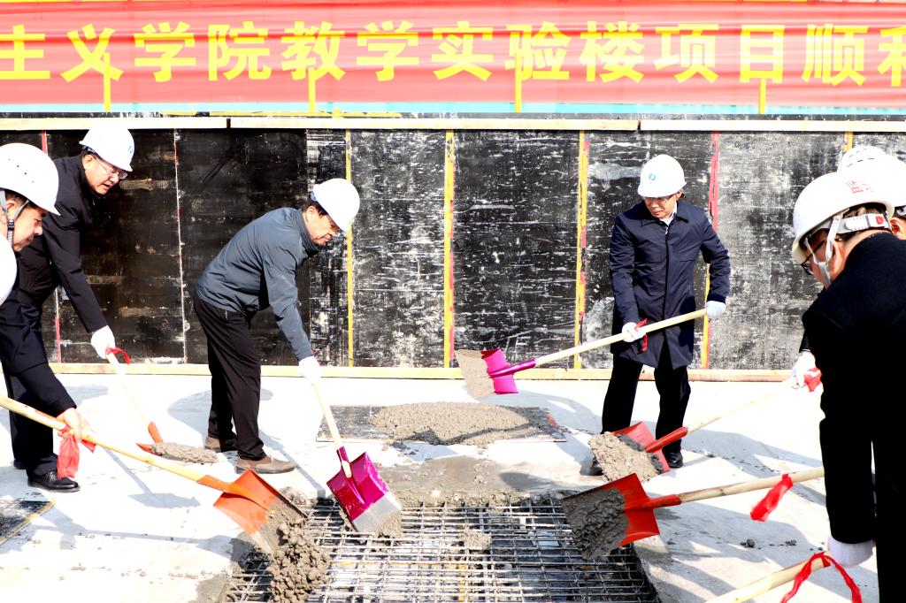 教学实验楼主体封顶仪式,校领导李星、何建国、王宏伟、刘炎胜出席封顶仪式。校领导及相关单位代表铲起混凝土为大楼封顶,共同见证了大楼最后一块混凝土板的浇筑过程。