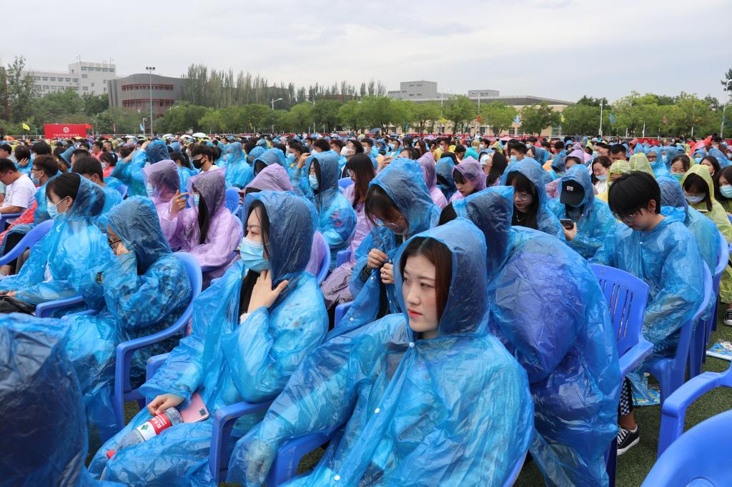 毕业生们身着雨衣,迎来了告别的时刻
