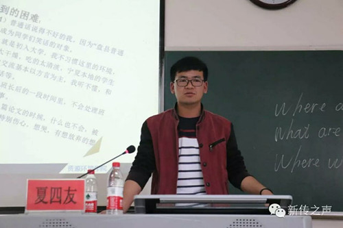 的夏四友同学和新传学子分享了自己从叛逆到下定决心努力拼搏的自我经历,并从自身感悟中提出出切实可行的建议,最后他以一句“大学四年,我们的目标是从青椒变成辣椒,我们不是最优秀的,至少是优秀者之一,追求自我存在感,不虚度大学四年年华。”来告诫同学们大学四年不可虚度。