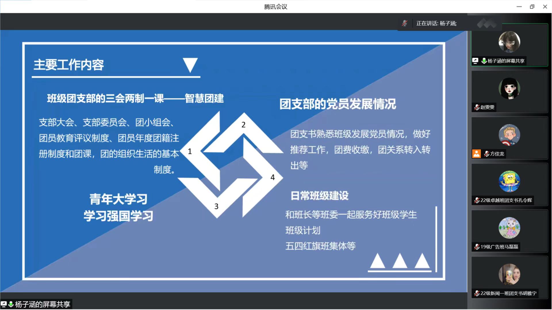 2019级卓越新闻传播人才班团支书杨子涵对团支书的主要职责做了详细介绍,从智慧团建、日常班级建设、党员发展工作等几方面梳理了团支书的主要工作内容。
