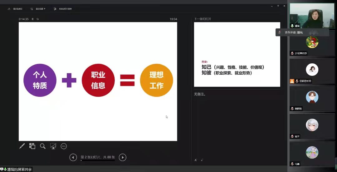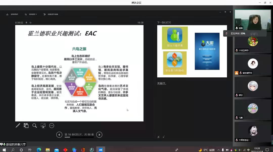 潘瑞谈到,就业是毕业生进入社会的一门必修课程,在这个过程中我们既要做到“知彼”,也要充分做好“知己”,才能在毕业时顺利走入职场。讲座中,潘瑞从“职业信息”与“个人特质”两方面为学生剖析怎样结合自身做职业选择。结合新闻传播学类专业和现实生活中的实际案例,潘瑞告诉大家“知己”就是要了解自身的兴趣、性格、职业价值观,对自己的个性特长及个人优缺点、专业技能及工作经验做出科学的分析,通过使用霍兰德职业兴趣测试和MBTI类型量表等测评工作,从多维度科学认识自己;潘瑞借助可视化数据图,帮助同学们做到“知彼”,告诉同学们可通过生涯人物访谈、专业实习,明确职业探索的方向和当今社会的就业形势,对职业环境、岗位工作内容、职业发展前景及行业发展前景作出科学分析,最后叮嘱同学们充分认识与就业相关的内外因素的关系,学会与外部环境和平共处,提前做好职业规划,提高未来求职就业的竞争力。