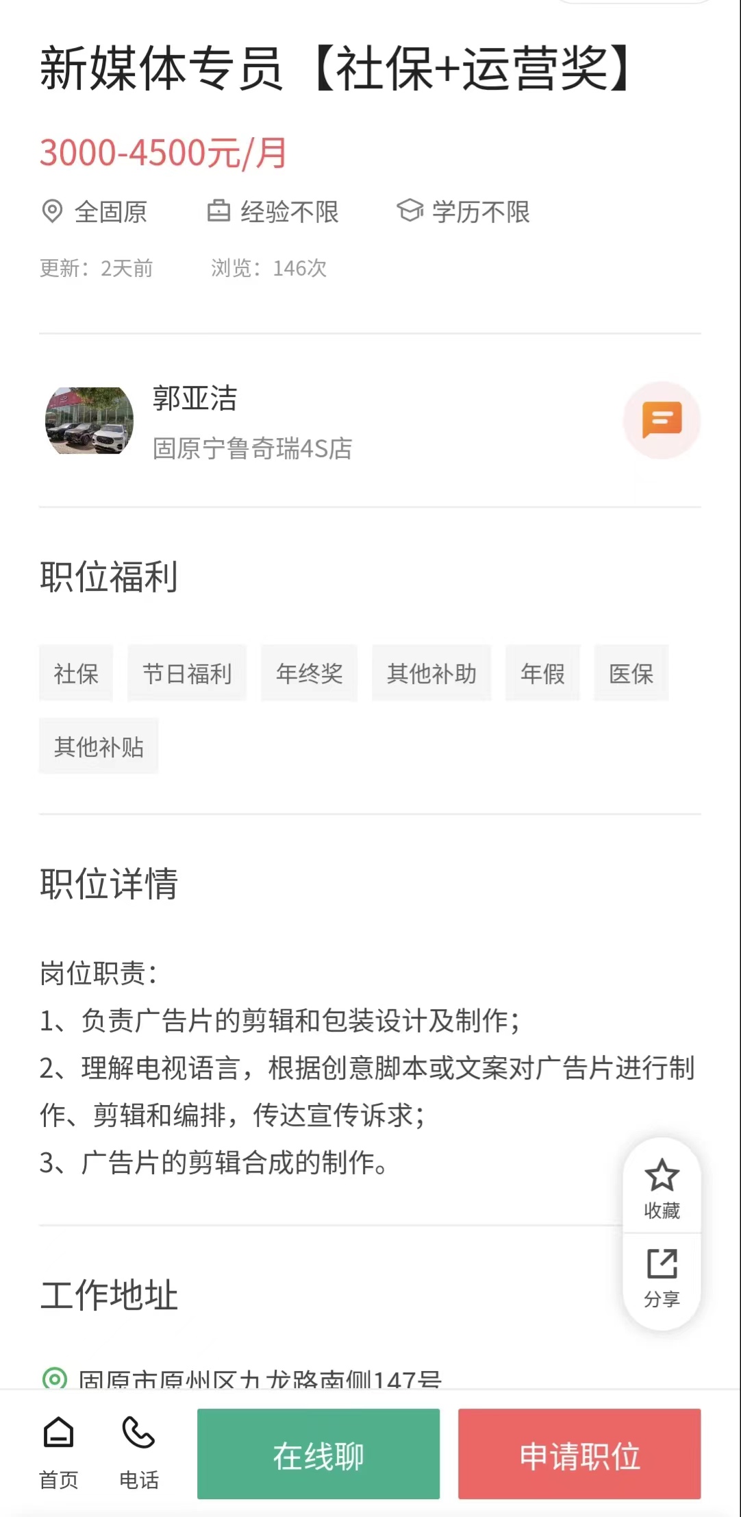 岗位:新媒体专员(社保+运营奖)