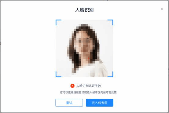 系统对接公安部数据,若认证成功可进入候考区,若认证失败可点击“重试”。若一直认证失败也可进入候考区,但在考官界面会提示“人脸识别认证未通过”,考生须将身份证原件在面试中展示给考官,进行“人证对比”。考试过程中,考官可以查看人脸识别时的截图,确保面试考生是参加人脸识别考生本人,避免替考。