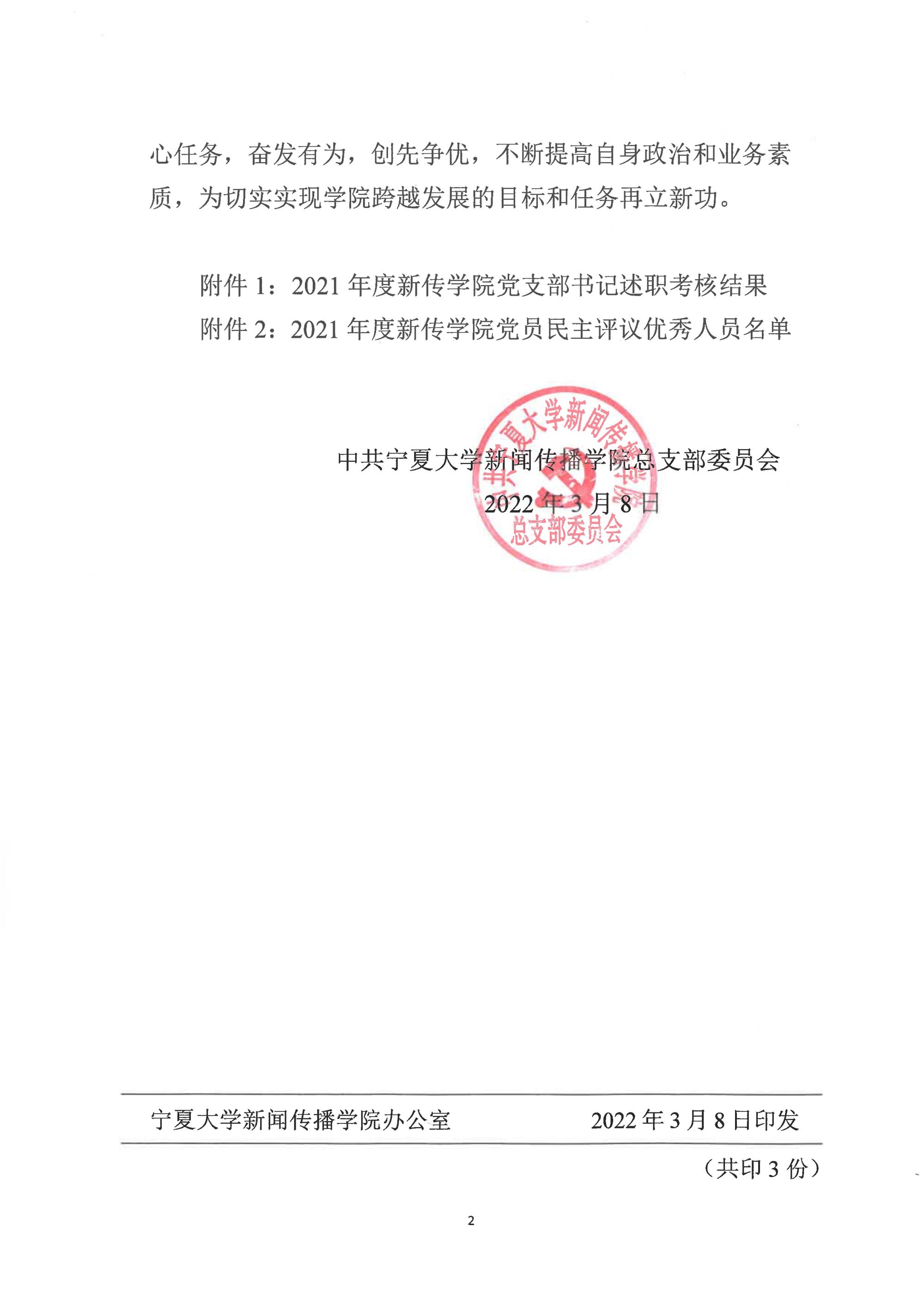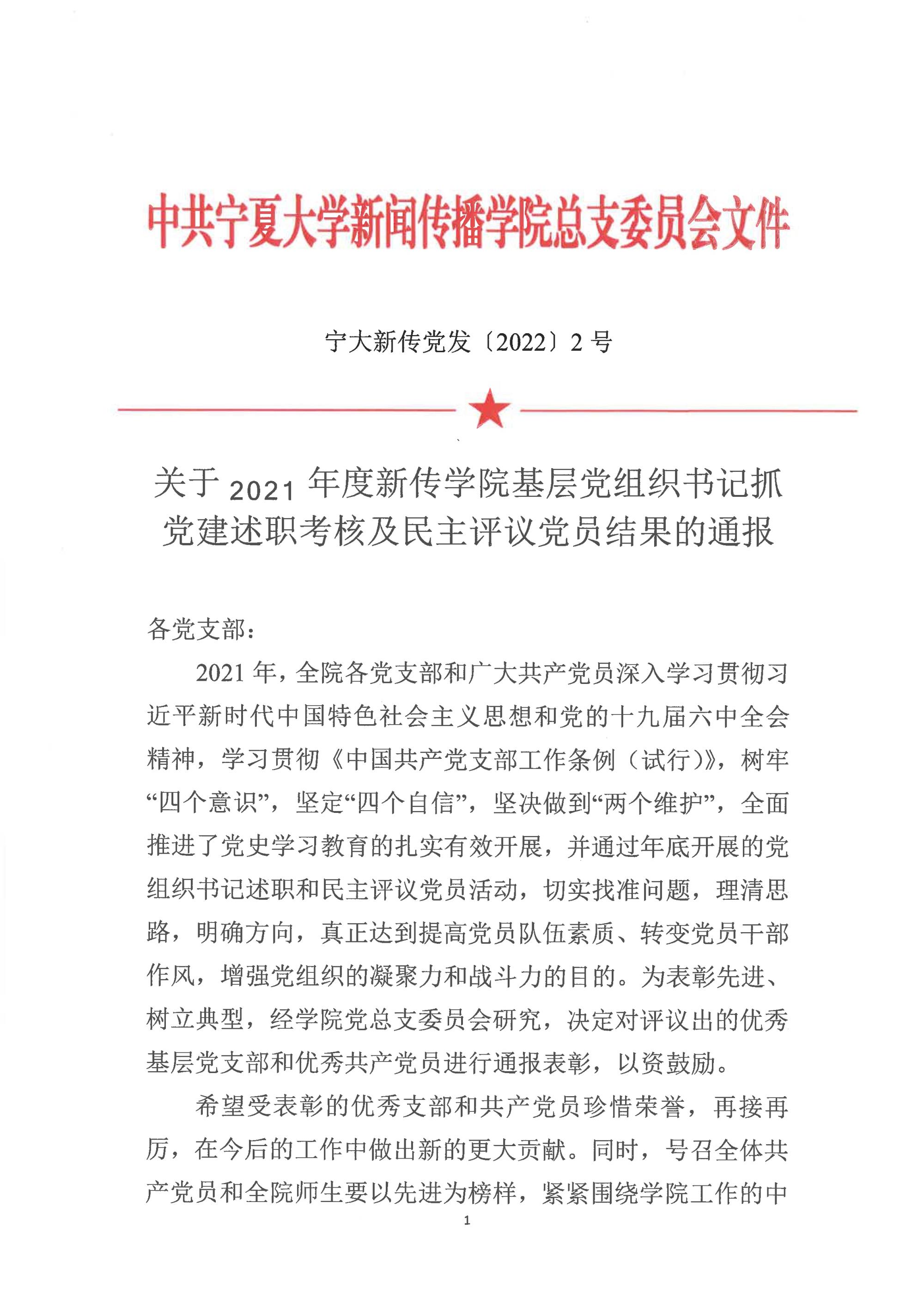 宁大新传党发〔2022〕2号 关于2021年度新传博彩体育 基层党组织书记抓党建述职考核及民主评议党员结果的通报
