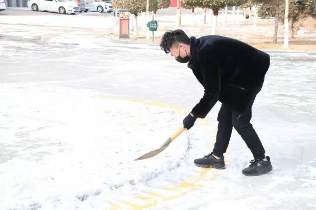 “师生扫雪大军”不畏严寒,有人用铁锹铲,有人用扫帚扫,相互配合,干劲十足。经过半个多小时的认真清理,原本结冰积雪难行的道路变得整洁又干净,保障了过往车辆、行人安全无阻。