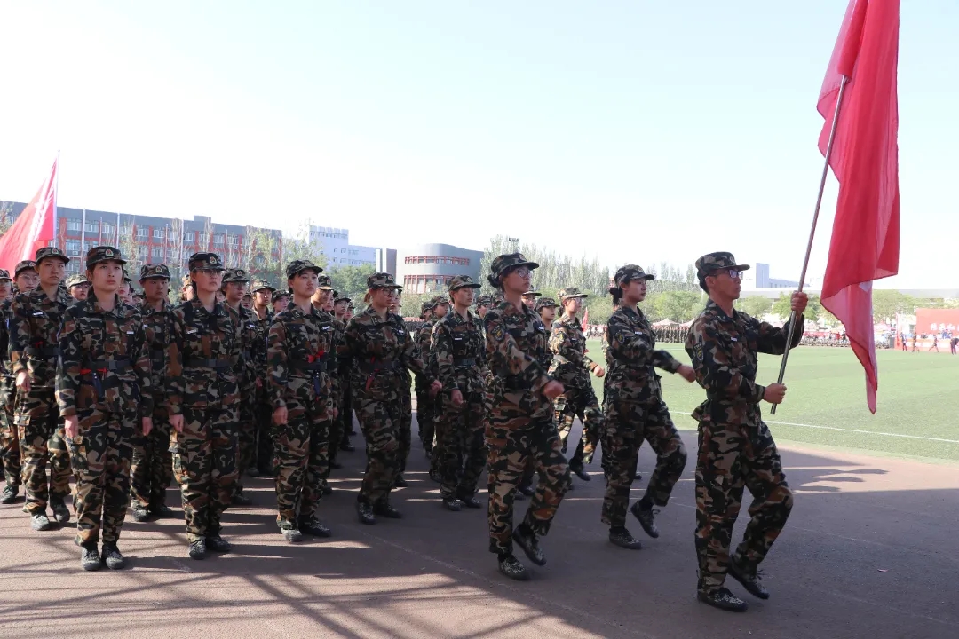 军训汇演由领导阅兵拉开帷幕,在标兵的带领下,分列式正式进行。新传学子们英姿飒爽,朝气蓬勃,踏着整齐统一的步伐,喊着响彻云霄的口号。