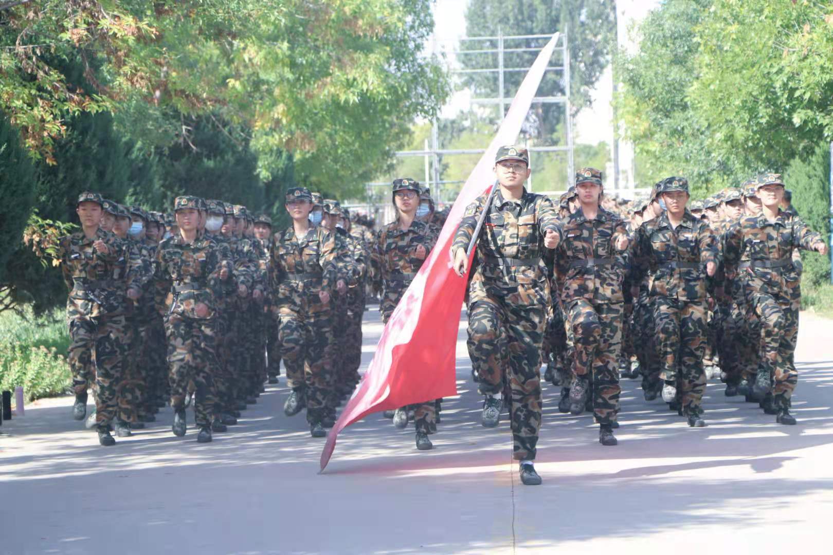 广阔的绿茵场上,旗帜迎风招展,放眼望去满目的军装迷彩,是葳蕤蓬勃的青春活力。今日阳光灿烂炳焕,微风习习,各营各队的军训任务都已过半,最终进入合训阶段。一人令,千人和。整齐划一的庞大队伍,队伍中的每位新生士兵正是如那歌中所唱“在奔腾的浪花里,我是哪一朵;在征服宇宙的大军里,那默默奉献的就是我。”在队伍里,军令如山,我将无我。