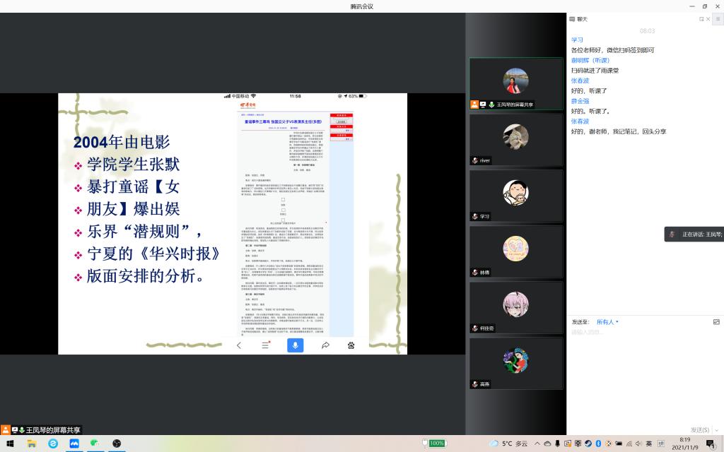 新闻编辑是严肃、细致的工作,王凤琴老师在课堂上强调,要用心对待基础的文字编辑工作,拒绝粗心带来的新闻偏差,要能够去伪存真、去粗取精。通过讲述、解析典型新闻事件,她还强调,面对来自各种渠道的信息和材料,在把好文字技术关的同时,更要把好思想政治上的关、路线政策上的关、法律法规上的关。此外,王凤琴老师充分发挥学生参与教学的主体能动性,围绕“张默家暴”“美国利用新冠疫情抹黑中国”等生动案例提出问题,引导学生通过分析、判断等思维活动对所提问题得出观点。