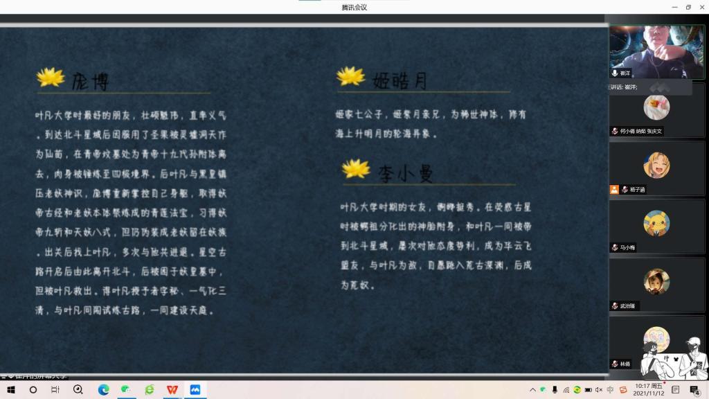 上述画面出现在11月12日上午2019级卓越新闻人才班的读书分享会上。19级卓越新闻人才班的崔洋正借助腾讯会议与大家分享最近阅读的网络小说《遮天》,同学们对他提出的问题积极思考,踊跃发言。