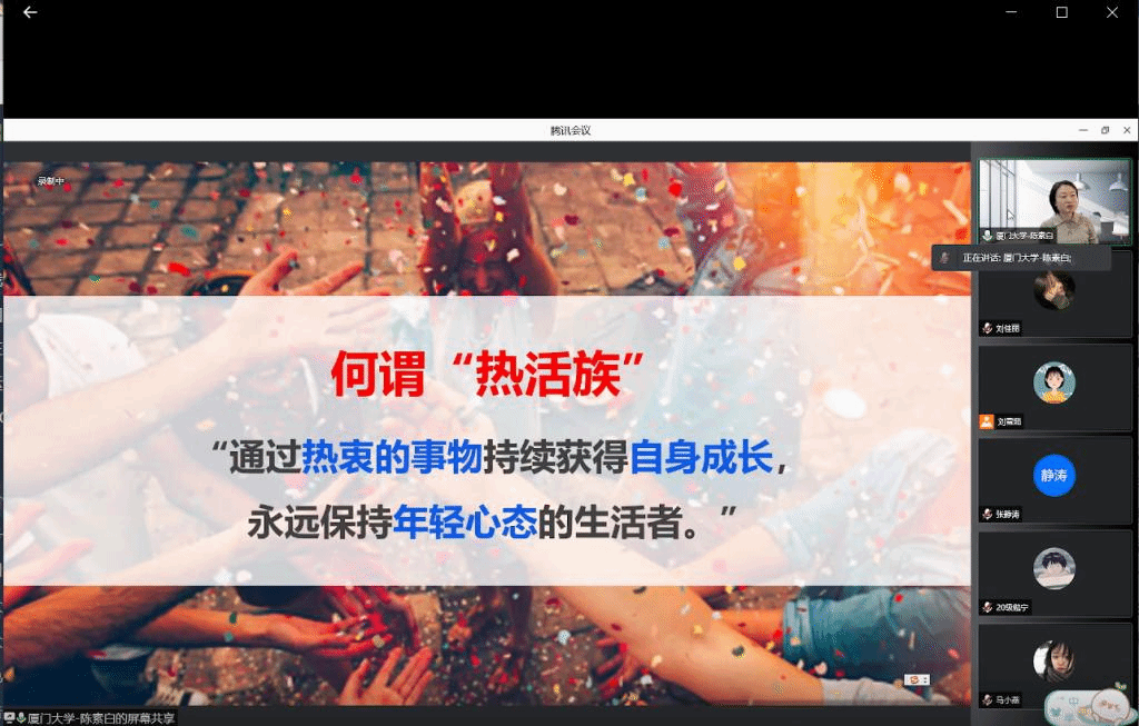 会议中,陈素白从三方面讲述了我们所处的“时代”——经济开始进入稳定增长期;科技生活所带动的消费热也趋于平静,以及人口构成逐渐少子老龄化,并伴随着这种时代的潮流变化,人们享受消费物质生活的热情降温;由于信息环境的变化与政府引导,人们享受生活的热情逐渐被激发,这种环境下“年轻化生活者”呈现出各年龄段都在广泛使用互联网,长时间使用手机的趋势。陈素白通过各类“年轻化”意识的调查报告和“年轻化”生活者的访谈来分析证实这种趋势,并以B站、抖音、微博多个社交平台的网络热图为同学们展示了——众多长者在对生活热情方面并不输年轻人,在生活者的眼中“年轻人”就是一种超越年龄限制充满活力的存在。针对老年人“年轻化”越来越普遍的现象,陈素白对“年轻人”与“年轻化”进行区分,并阐释了“热活族”这一概念。