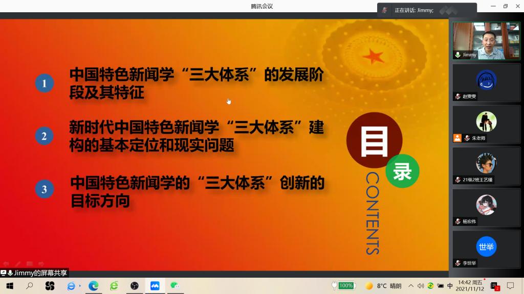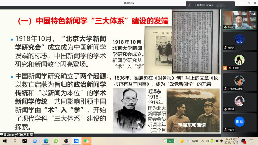 随后,季为民简要地将中国新闻学分为开创奠基、思想回归、改革突破三个历史阶段,并将三个历史阶段中的中国新闻学发展一一讲解。他指出新中国成立70多年来,我国新闻学不断创新发展,建立了以马克思主义新闻观为核心内容的中国特色新闻学,逐步形成了自己的学科体系、学术体系、话语体系。(简称“三大体系”)