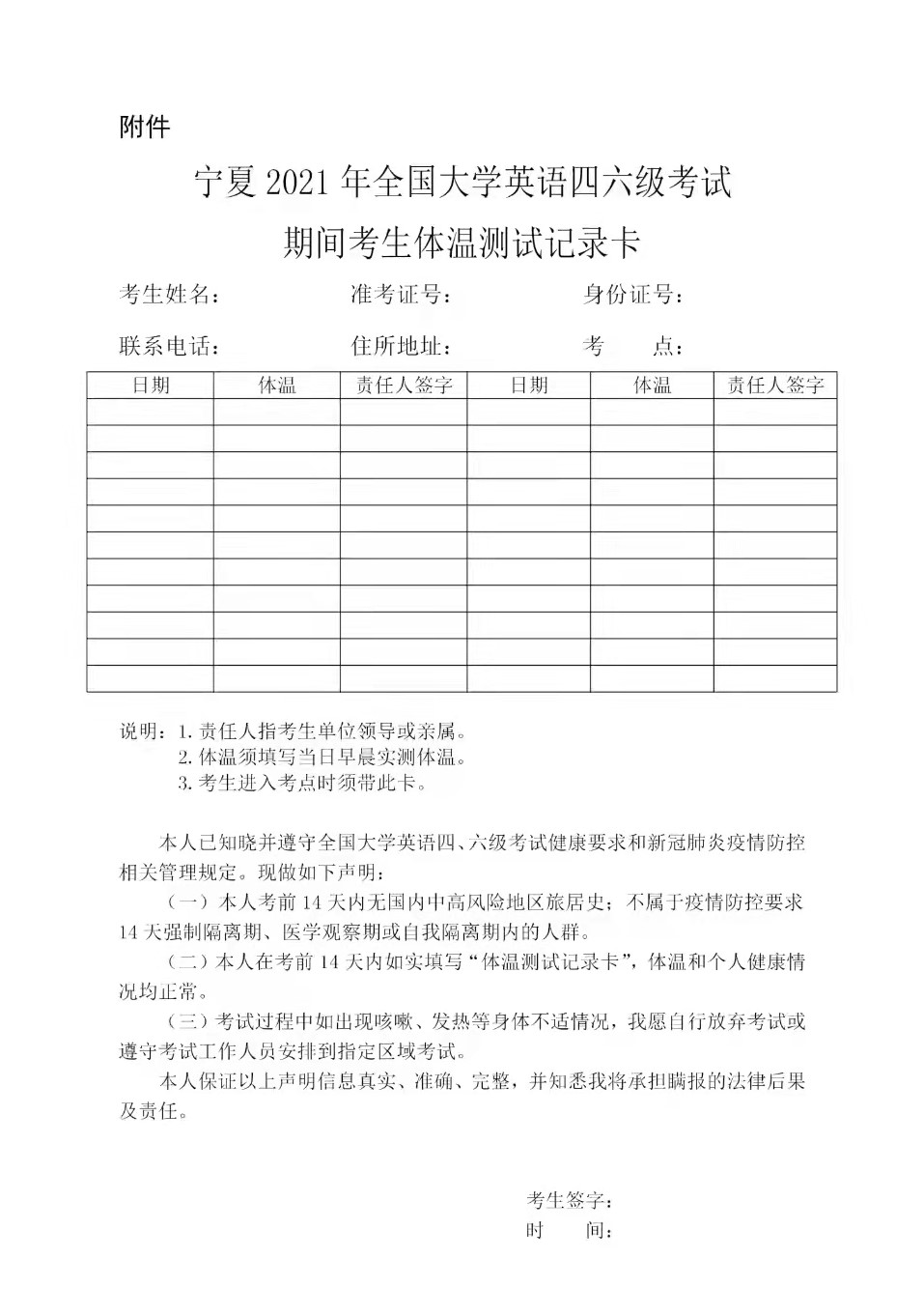 1.请考生做好备考期间个人日常防护和健康监测,按要求如实填写《宁夏2021年全国大学英语四、六级考试考生健康情况声明书和体温自我监测登记表》的相关信息并签字确认,考生对《宁夏2021年全国大学英语四、六级考试考生健康情况声明书和体温自我监测登记表》真实性负法律责任。