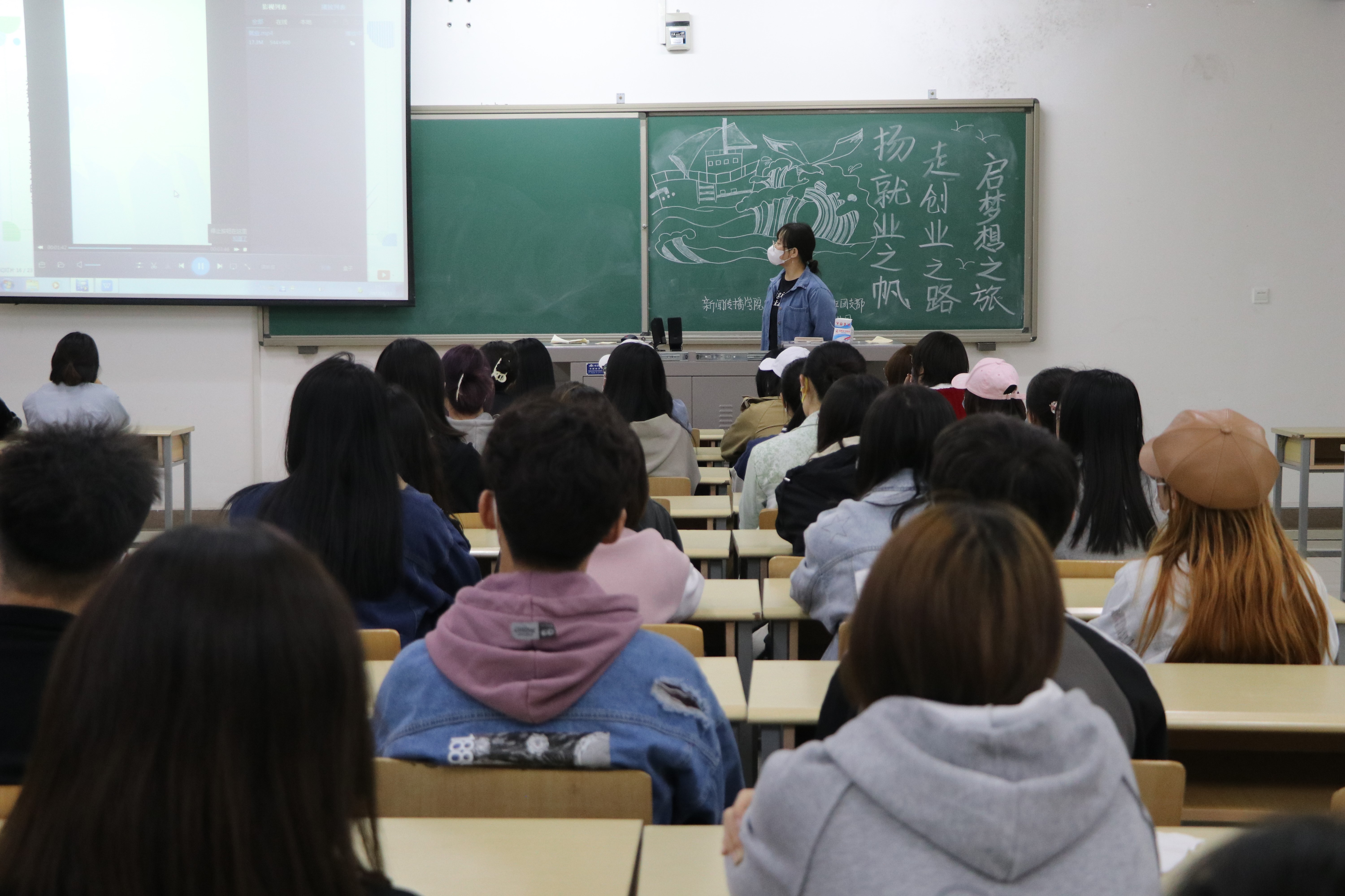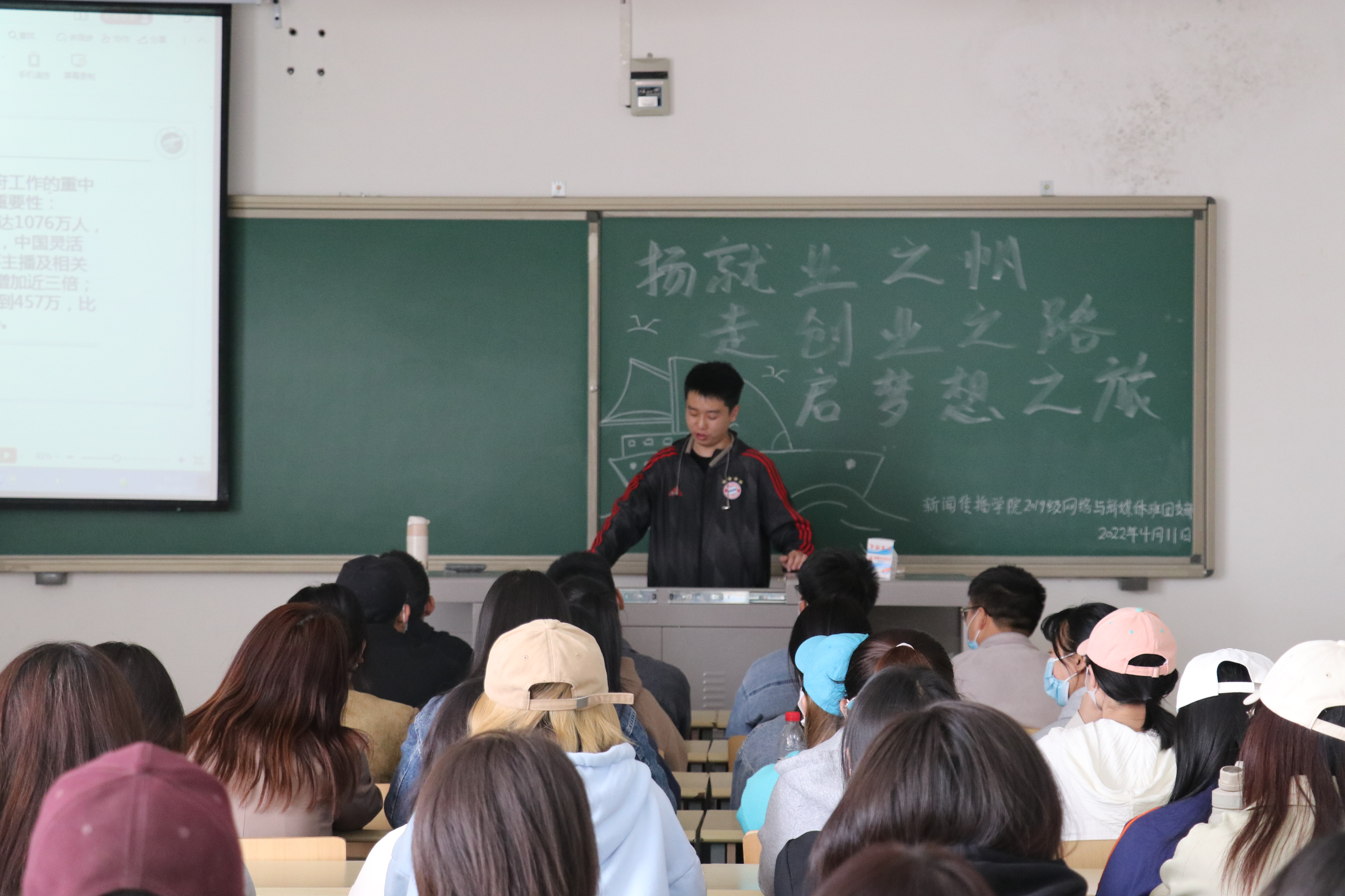 活动伊始,20级网络与新媒体班团支书虎娟通过播放视频,引导同学们了解当前大学生就业形势。她讲到:“当前社会应届毕业生的规模逐渐扩大,但就业岗位却持续减少,就业焦虑和求职压力不断增加,这样的就业形势要求同学们对就业创业相关内容进行广泛的了解。”21级学生任涛在发言中说:“大学生应当从理性角度出发去看待社会,在实践中处理好能力与需求的矛盾,全方位的磨练自己。”