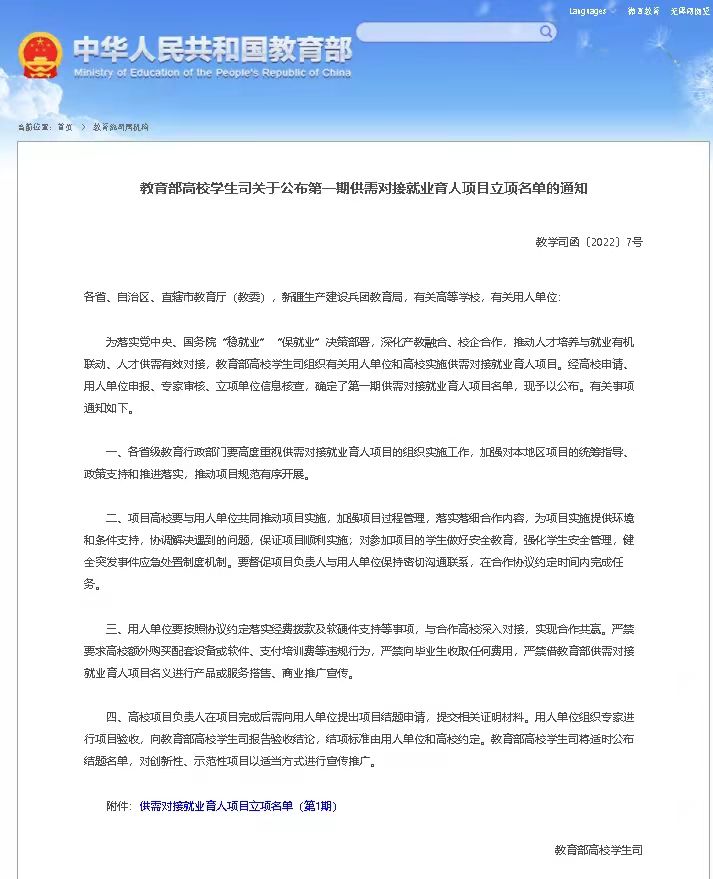 为落实党中央、国务院“稳就业”“保就业”决策部署,深化产教融合、校企合作,推动人才培养与就业有机联动、人才供需有效对接,教育部高校学生司组织有关用人单位和高校实施供需对接就业育人项目。博彩体育