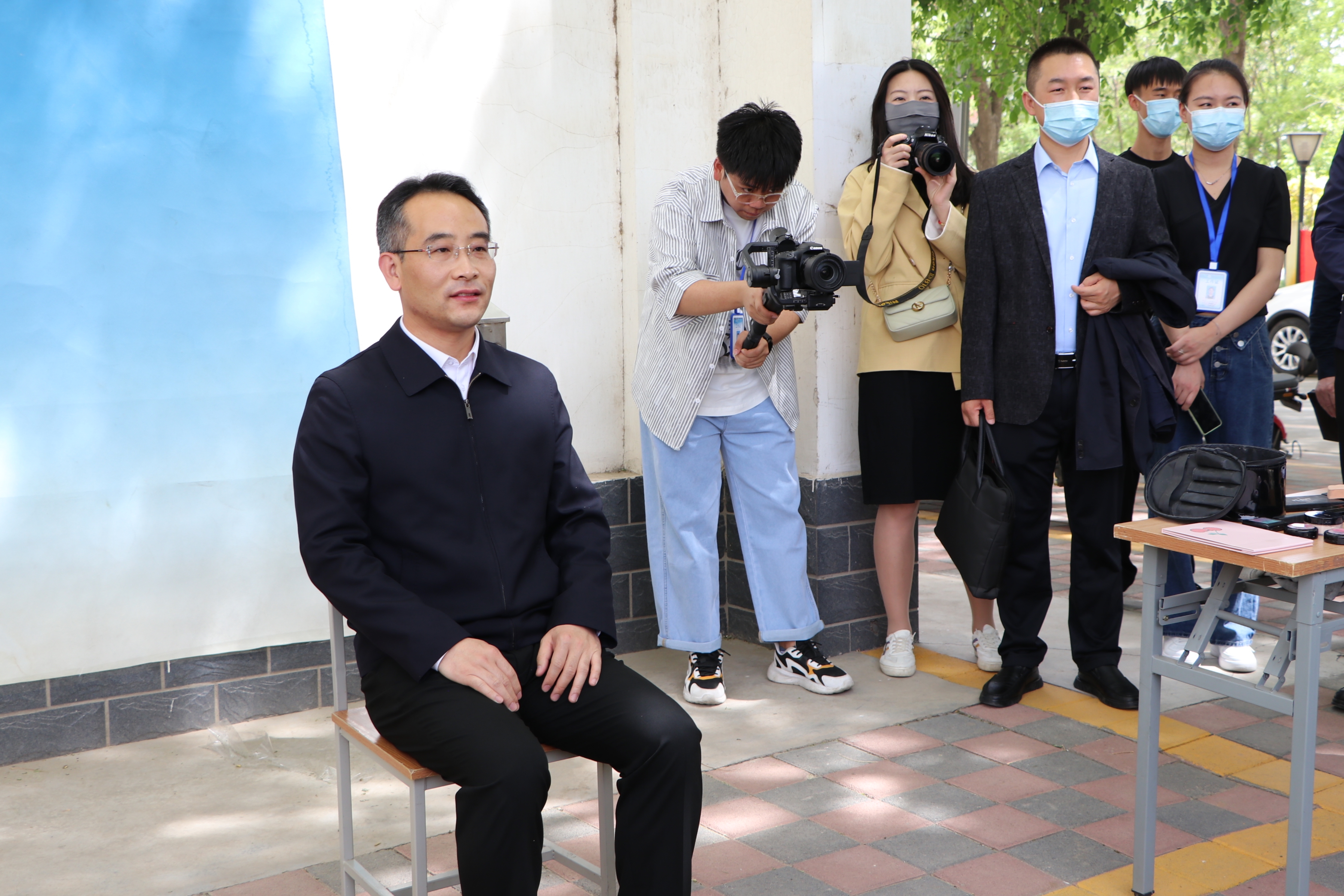 校园网红打卡风景点的拍照,“用专业为师生服务的理念很好!”彭志科和史金龙非常肯定这项志愿服务活动,并主动体验拍摄了1寸证件照。