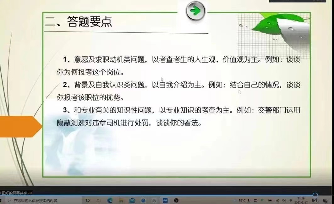 •和专业有关的知识性问题,以专业知识的考查为主。例如:交警部门运用隐蔽测速对违章司机进行处罚,谈谈你的看法