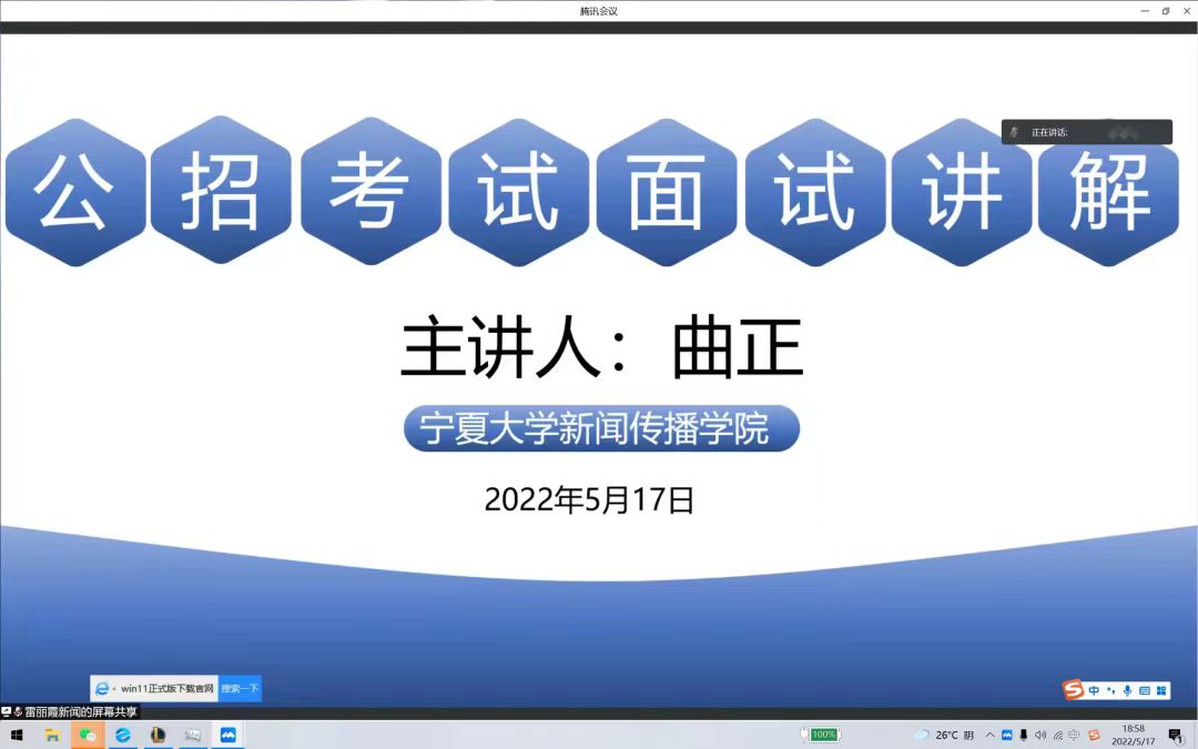 特邀现任宁夏社会学会副会长、宁夏社会工作联合会会长曲正于腾讯会议开展了以“公招考试面试讲解”为主题的线上讲座,学生办公室主任雷丽霞主持,2020、2021级研究生,2018、2019级本科生参加。