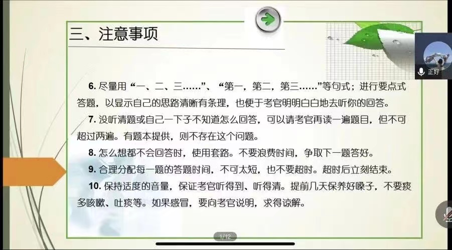 •谈吐文雅。注意讲普通话,要简洁条理,流畅清晰,语速适中,避免“嗯、那么”等口头语,把握时间,谨慎补充。
