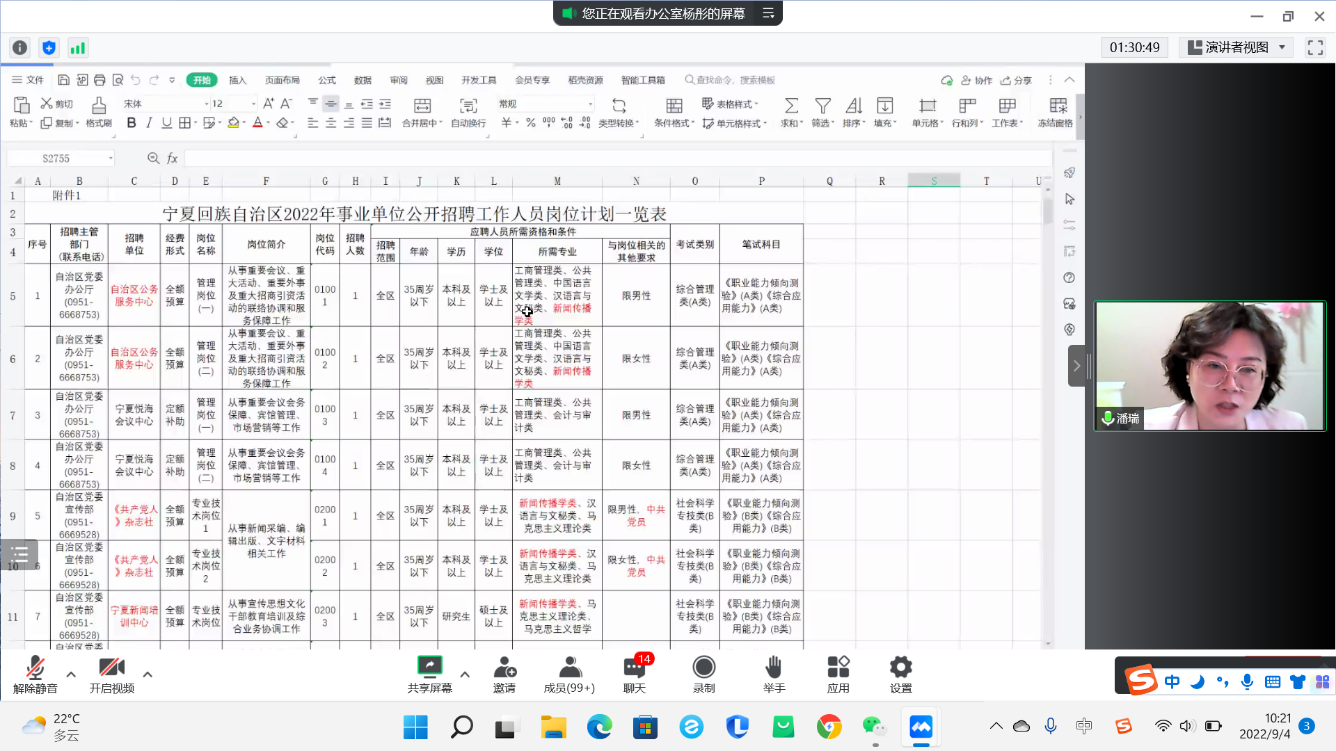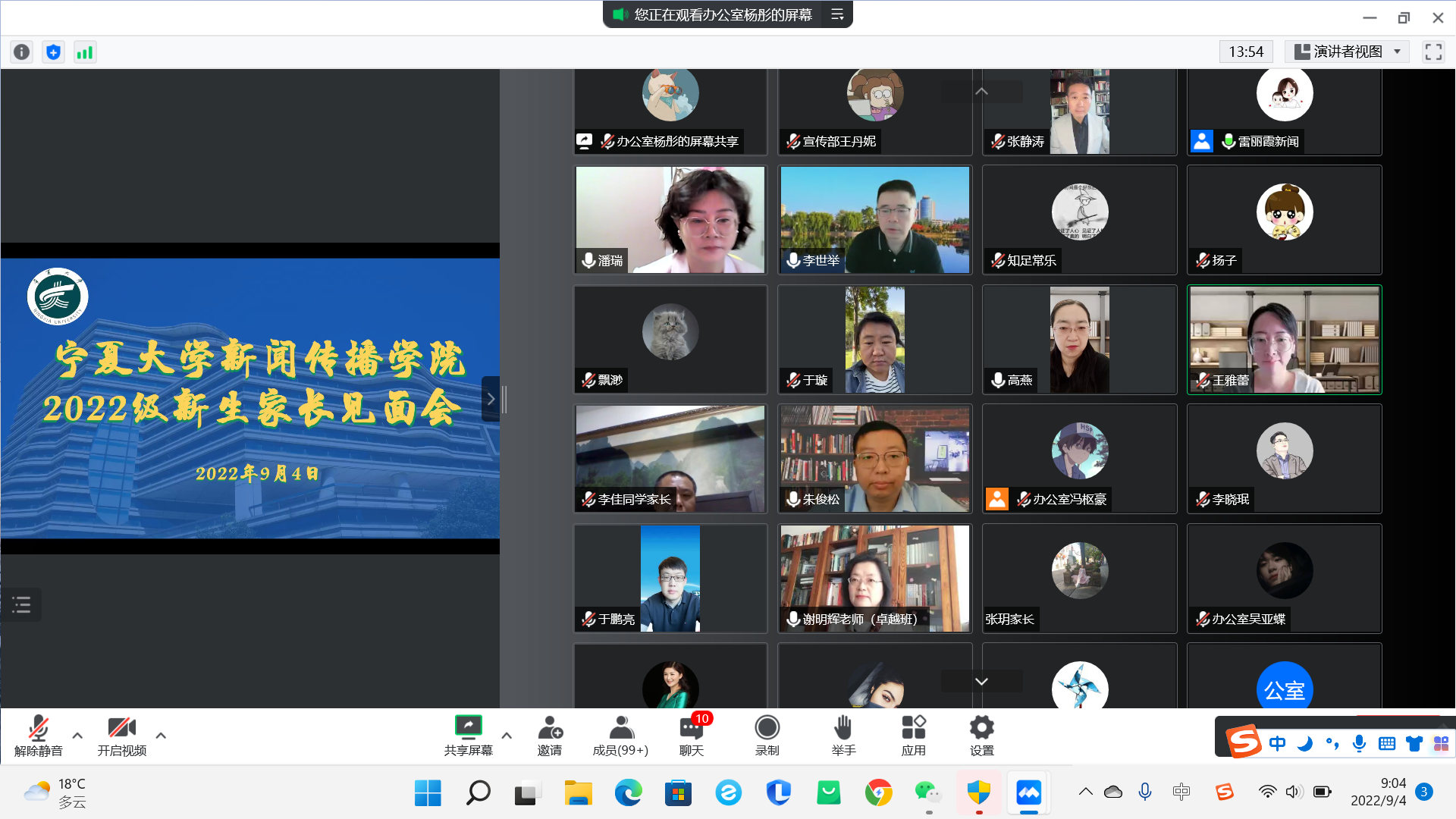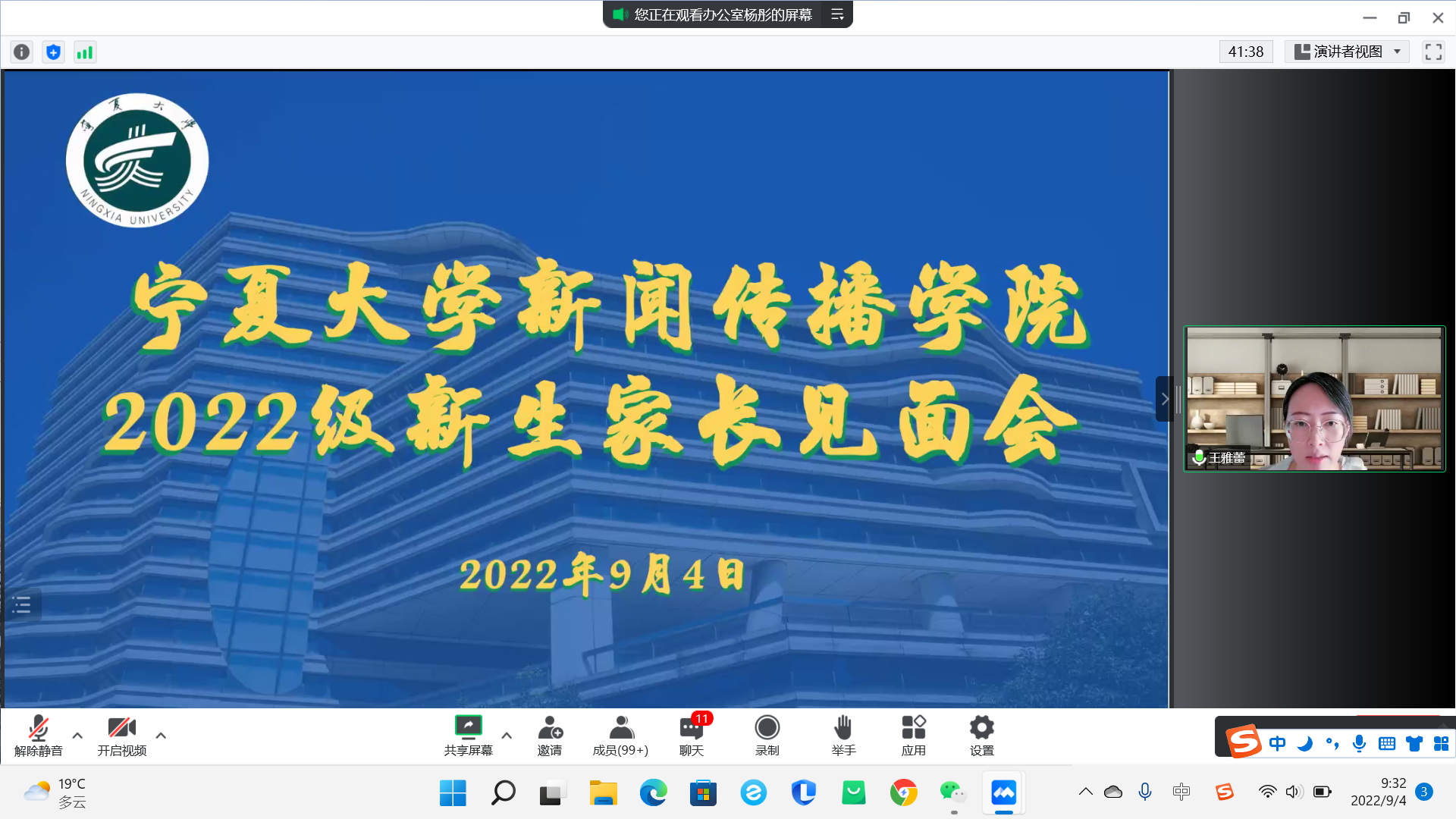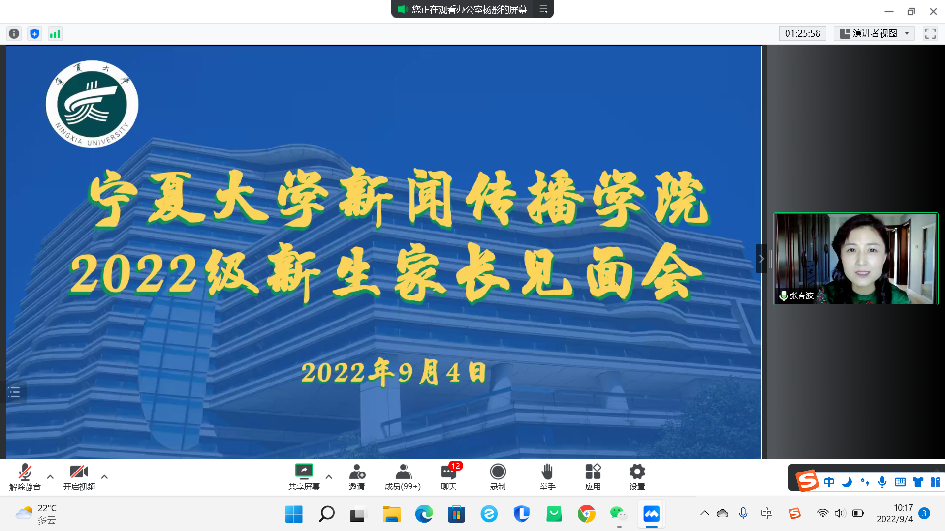 领导班子成员、系主任、新生班主任及2022级本科生、研究生及新生家长在云端参加了会议,会议由学生工作办公室主任雷丽霞主持。