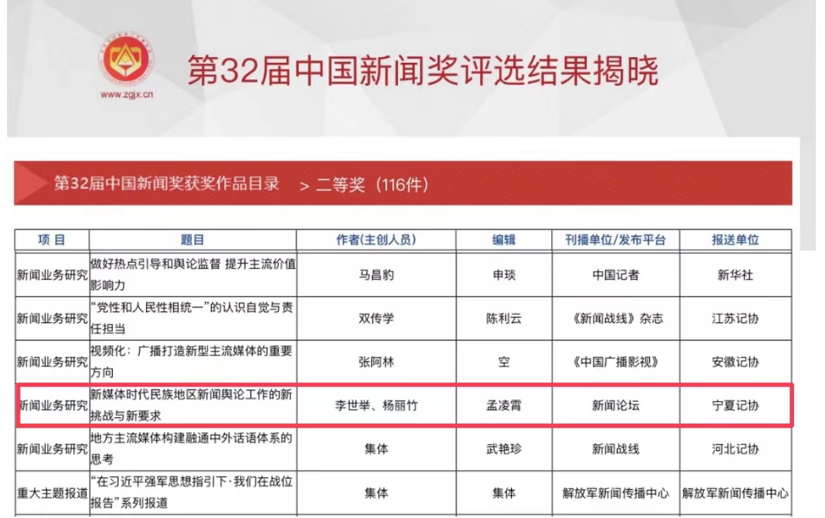 执行院长李世举、研究生杨丽竹撰写的新闻业务研究论文《新媒体时代民族地区新闻舆论工作的新挑战与新要求》荣获二等奖。
