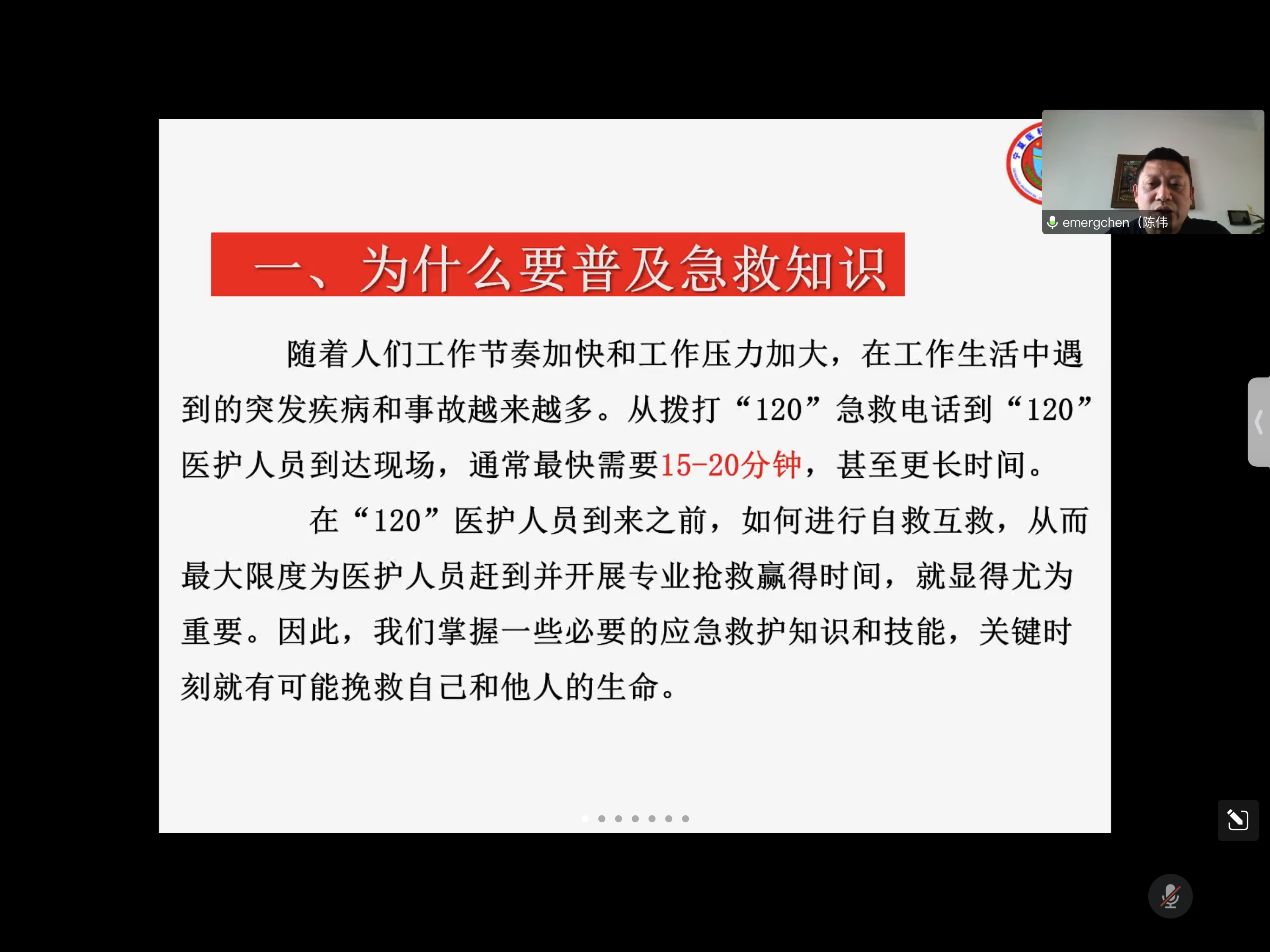 张静涛在总结中指出,陈伟的讲解简洁直接,全面深刻,不仅让参会人员了解了紧急救护的相关知识和操作方法,提高了自救互救能力,还使大家认识到了生命健康的重要性,传播了健康理念,利于形成人人关爱生命、重视生命的良好氛围。