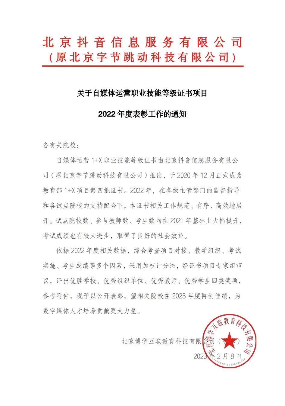 2月8日,北京抖音信息服务有限公司(原北京字节跳动科技有限公司)发布自媒体运营1+X职业技能等级证书项目2022年度获奖结果:博彩体育