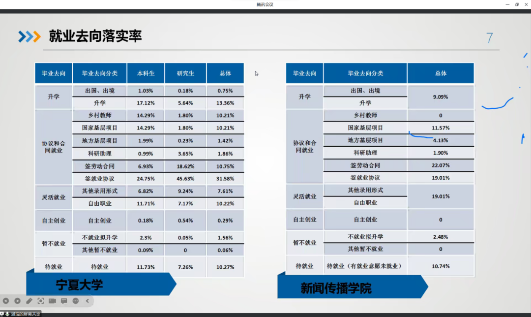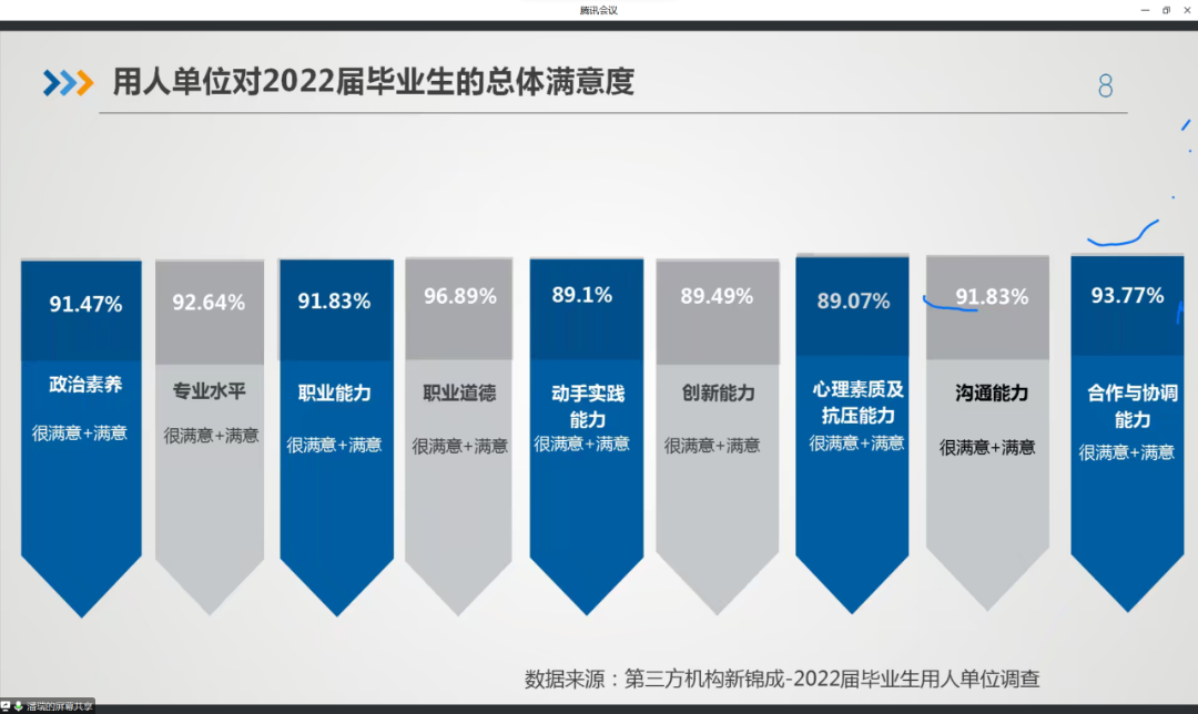 毕业生在乡村教师、国家基层项目、地方基层项目毕业去向落实率仅为15.6%,升学比例仅为9.9%,希望2023届毕业生正确认知自己,结合专业特点,到企业就业,先就业后择业。