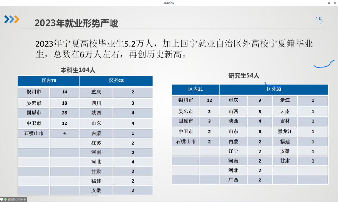 潘瑞对自治区鼓励毕业生到企业、基层就业的政策和《宁夏基层就业学费补偿、国家助学贷款代偿制度》进行了详细解释,对我国的应征入伍政策进行了说明,为毕业生就业提供了新思路。