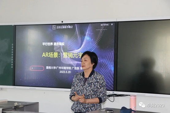 李苗老师主要讲的是最近爆红的chatgpt,她首先向学生提问:chatgpt与营销元宇宙能擦出什么样的火花?其中王艺瑾同学说,与我们最息息相关的可能是论文写作了吧。李老师说:“除了这些,它还能生成创意产品(文字,图片,视频)等等。”同时大家都在担忧学生都用chatgpt写论文,那老师可犯了难,但有矛就有盾,已经有人研究出来了专门检测的工具。随后又讲解了关于AR/VR的元宇宙场景营销,通过视频为我们展示了宜家用AR预览多个虚拟商品,大家都不禁感叹新技术的强大。