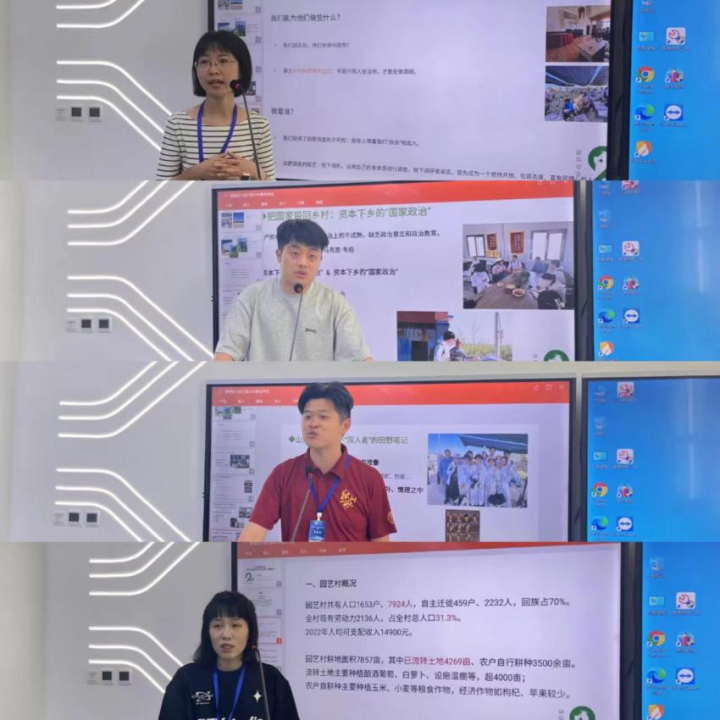 西南政法大学博士生赵雅馨、台湾政治大学博士生潘彦博、山西大学硕士生屠晨皓、中国人民大学博士生徐铭兼代表第三组进行结课汇报。赵雅馨仔细解读了闽宁镇园艺村一位老人的自述,她强调个体口述的生命史常常与社会要素交织,老人的夕苦今甜是乡村变迁的另一种表达。潘彦博反思了乡村调查中研究者与被研究者之间的关系,她认为研究者虽然以调查为目的,但不应把这种目的性奉为圭臬,反而要注意同理心的表达与对当地语境的理解,与当地人建立非功利的共同记忆。屠晨皓以把国家带回乡村为主题,以闽宁镇的资本结构发展与变迁为依据,从组织层面、个体层面以及经济层面讲述了国家政治如何成为下乡资本的驾驭者。徐铭兼将自己比作一个田野的“闯入者”,他观察到闽宁镇身处宁夏,但一直作为福建援宁的象征,它生产的白萝卜又远销韩国,时间要素与空间要素的堆叠使得田野铺展为一幅“画卷”,层次丰富而特征明显。