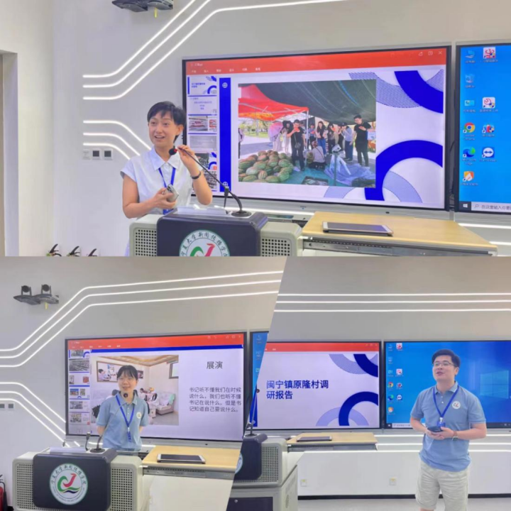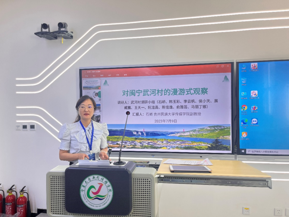 安徽大学硕士生李玥轩代表第一组进行结课汇报。李玥轩表示,暑期班的课程主题集中、强度高,让人徜徉在乡村传播的理论世界中,而在闽宁镇福宁村的调研经历则使小组成员深刻体悟媒介技术与乡村社会的勾连。李玥轩总结,乡村数字化并非是对城市信息技术简单的“复制”,而是数字化与乡土智慧的结合在生产生活中的生动体现,不是媒介“选择”乡村,而是乡村“主动拥抱”媒介并与环境发生互动。