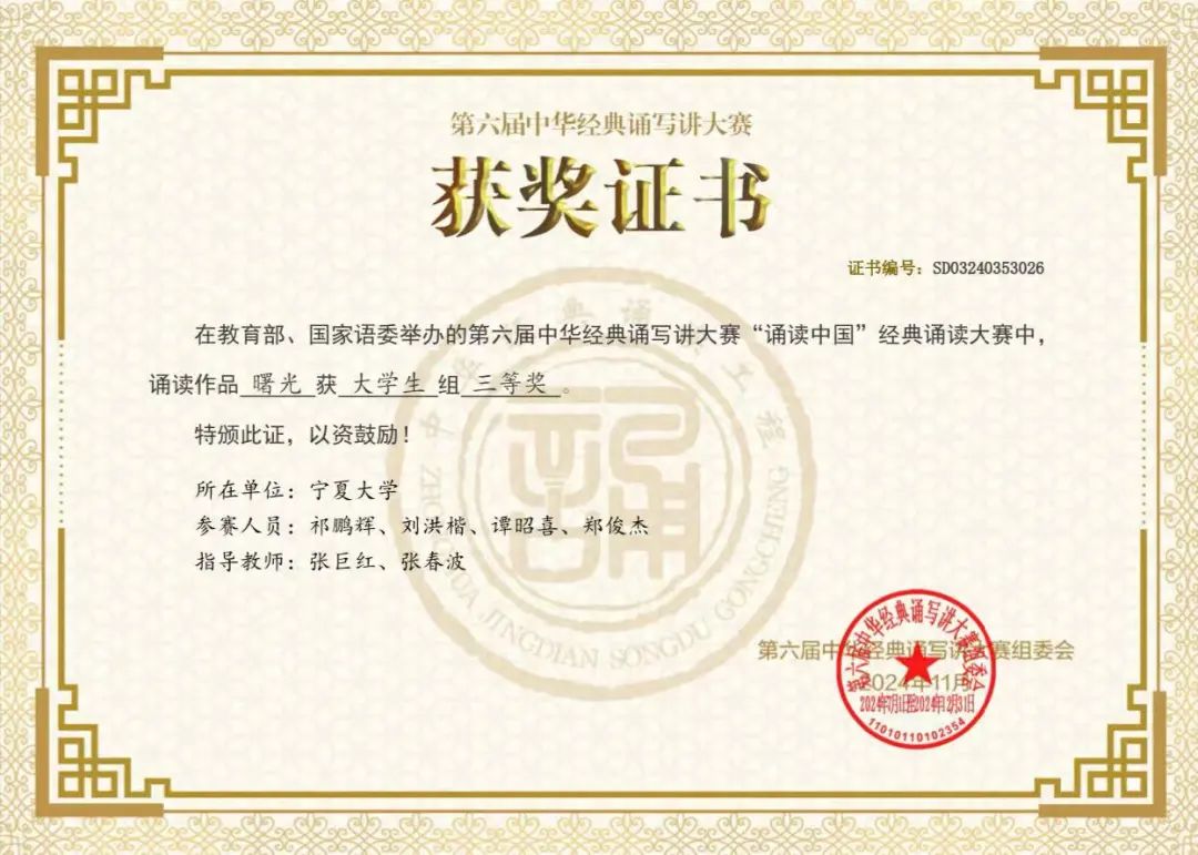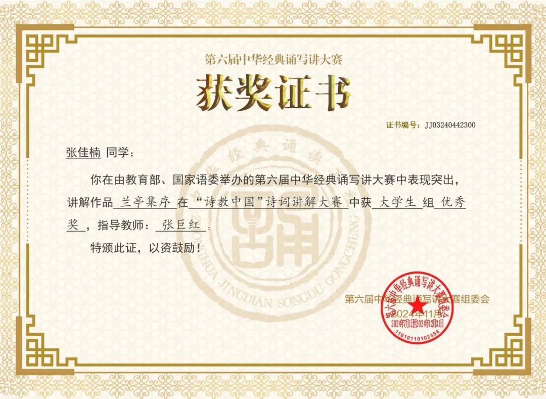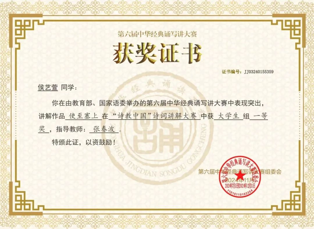 第六届中华经典诵写讲大赛是由教育部、国家语委主办,大赛覆盖了全国大中小学各个层次,涵盖了高校的各个专业,2023年被列入《全国普通高校大学生竞赛分析报告》竞赛目录。