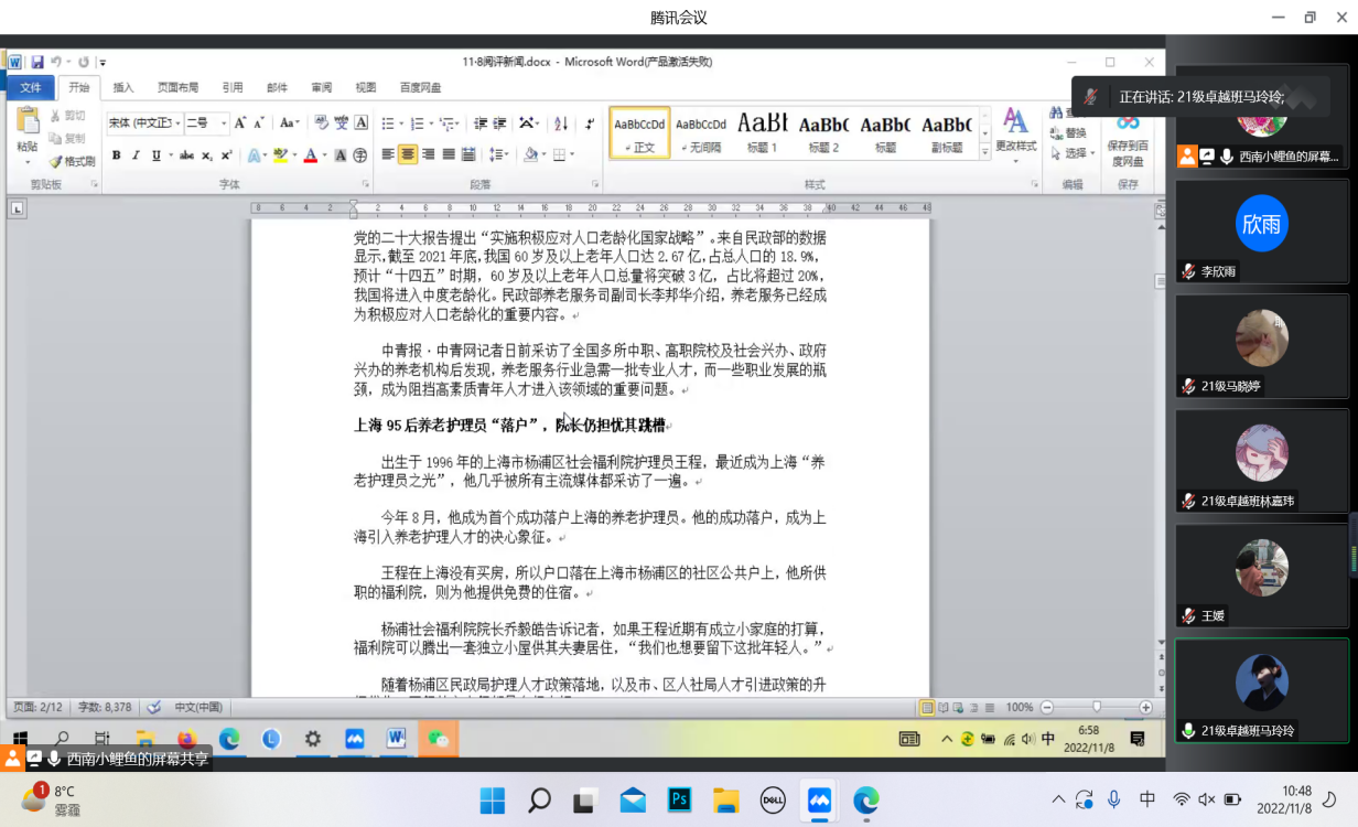 11月8日上午,新闻系开展期中教学检查线上教学观摩活动。本次观摩课为面向2021级卓越新闻班的“新闻采访与写作”,由俞运宏老师主讲,新闻系全体教师听课。