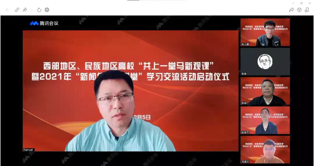 张百新表示,西部地区、民族地区高校新闻传播院系是我国新闻传播教育的重要组成力量,期待中国新闻传播院校培养出更多爱中国、会讲中国故事的新闻传播优秀人才;曾祥敏介绍了用新闻一线最生动的实践诠释新闻行业时代精神的32位主讲人情况;张昆认为此次活动创建了新的协作方式,共同促进“新闻传播大讲堂”落地生根,为缩小东西部教育差距提供了契机。