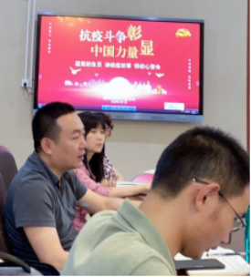 及身边教师的抗疫故事进行分享。李锦老师讲述了支部书记冯雪俊老师陪伴语言不通的学生去医院进行身体检查的故事,曾柱老师讲述了身边的汉语教师朋友在各个国家的努力,张喆老师分享了疫情期间遇到的毕业生求助的故事等等,这些故事让大家再一次认识到“一日为师”的责任,在疫情期间,老师更应该将学生放在心中,关心学生身心健康,尽力帮助学生解决各种困难。