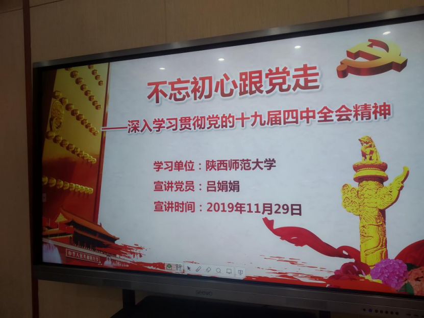 研究生第二支部党员吕娟娟同志以“不忘初心跟党走”为主题,从十九届四中全会会议通过的重要文件、总体目标、党的初心和使命、中国共产党执政的独特优势等方面对十九届四中全会的精神进行解读,通过讲述户县玉蝉镇涝峪口村低保贫困户安闯娃脱贫致富的故事来突出中国共产党执政的独特优势,在共产党的领导下,我国的贫困人口锐减,中国的脱贫工作赢得了世界的喝彩,始终坚持党的领导,才能确保国家始终沿着社会主义方向前进,才能发挥社会主义制度的优势,办好中国的事情,关键在党。