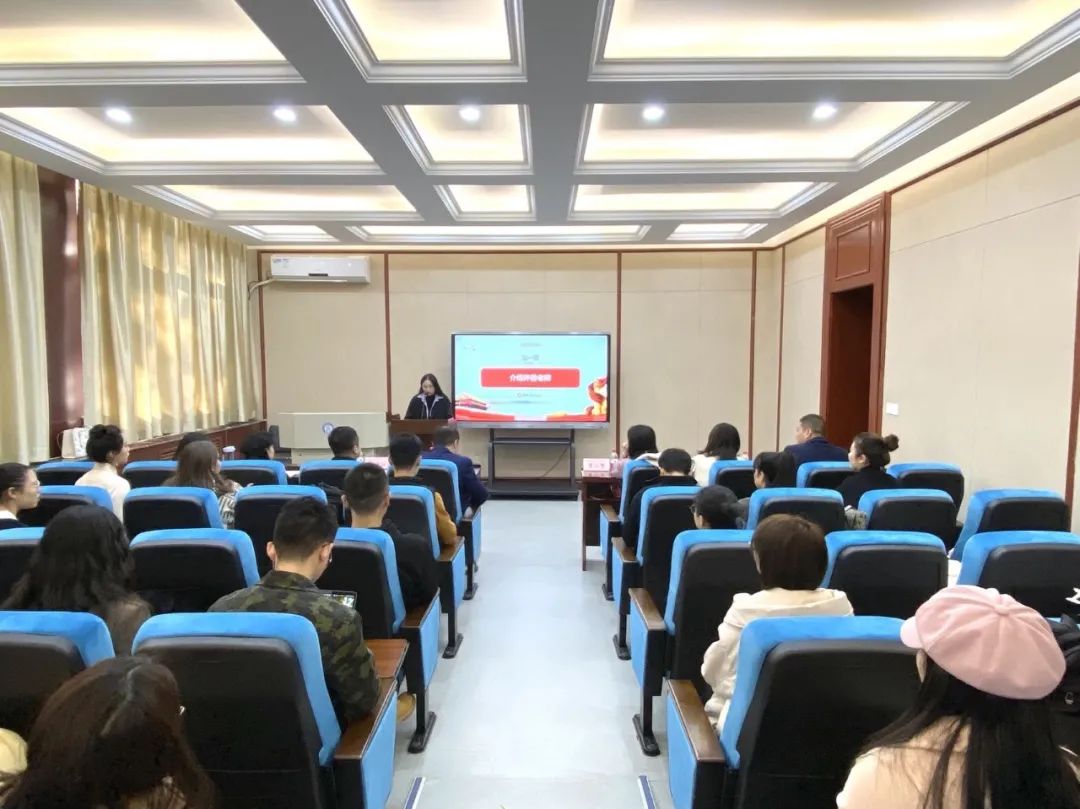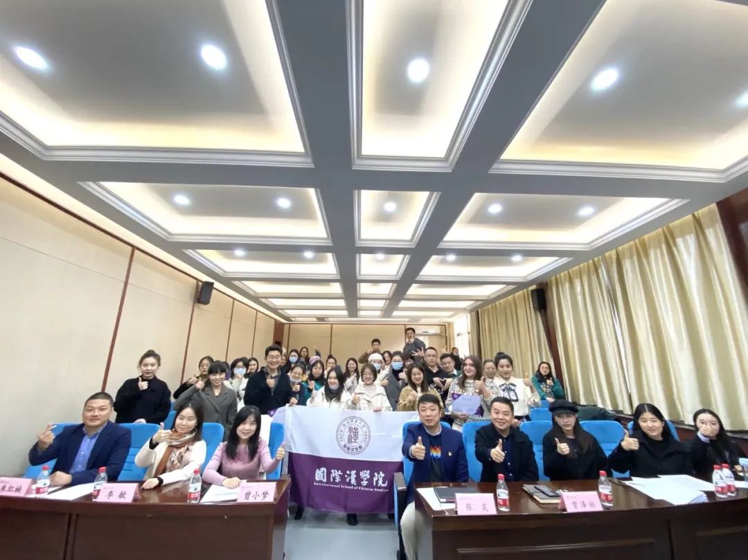 一层报告厅正式开始。党总支副书记张昊、副院长贾泽林、中华文化国际传播党支部曾小梦老师、国际中文教育党支部李敏老师以及党总支组织员朱红楠受邀作为评委出席。