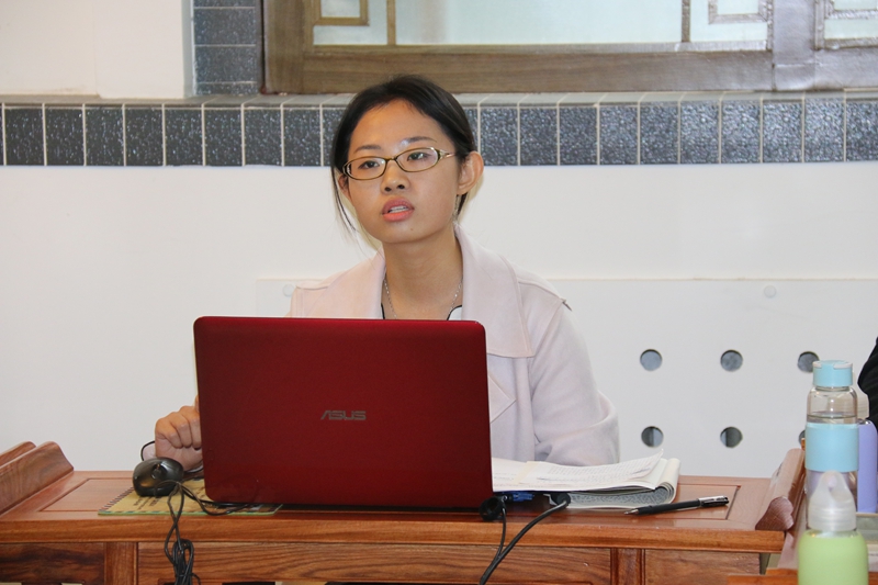 首先,第一位报告人靳晓玮对她的论文《浅议义素分析法在对外汉语高级词汇教学中的应用》进行了详细的介绍和讲解。她用实例充分展示了义素分析法在教学中的使用,在讲解过程中向现场观众提问互动,将枯燥的学术研究以轻松幽默的方式论述给听众,极大地提高了听众特别是留学生的兴趣和关注度。最后,她对自己的论文进行了剖析,列出了优点和稍有遗憾的地方。
