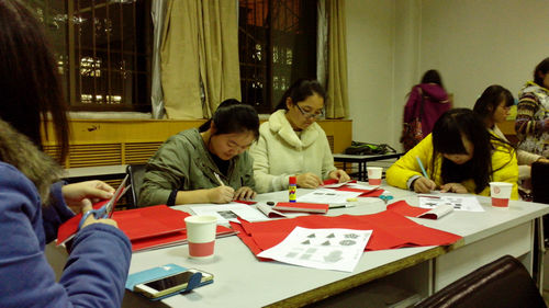 晚7:00,活动准时开始。活动中参与者被分为7组,活动围绕了解剪纸、熟悉剪纸的剪法、抽取主题、通过游戏抢夺道具、制作主题剪纸等环节展开,由国际部部员负责带领外国留学生了解、制作剪纸。参与者了解完剪纸的相关视频——《剪纸姑娘》后,剪纸的制作正式开始。活动中还穿插了精彩的抢道具游戏环节,两轮游戏各具特色,充分体现了设计者的匠心独运。尤其是第二轮游戏“水果蹲”,由于参与度更广,可操作性更强,全场气氛空前热烈。