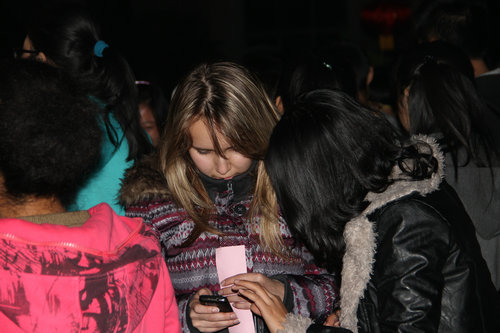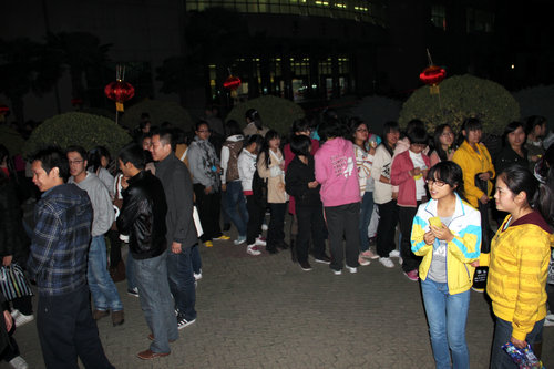 猜灯谜结束后,许多同学仍感到意犹未尽,不愿离去,他们高兴地和外国留学生交谈着,三两一堆。现场人声涌动,大家谈得不亦乐乎,音响中的高山流水与春江花月夜的古筝曲创设了空灵古朴的氛围。
