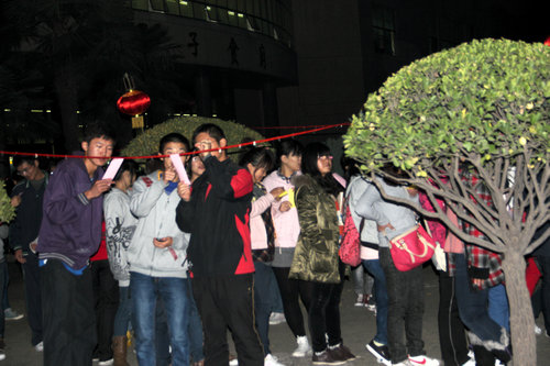 活动现场处处充满了工作人员独具匠心的设计:红黄蓝三色纸条上写着难易程度不一的谜面,一个个红灯笼挂在树梢透出浓浓的中国风,而社团成员们来往穿梭的身影更是一道亮丽的风景线。因此,活动还没开始,现场就已经吸引了众多学生驻足观看,呈现出火爆的场面。