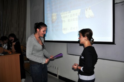 接着,由中外朋友共同参与的猜词和情景再现两个游戏将全场的气氛推向了高潮。由于留学生汉语水平有限,在猜词时不时会闪现幽默的语言和诙谐的动作,中外朋友之间的默契配合都博得在场同学阵阵掌声。简单的游戏拉近了中外朋友之间的距离,相同的语言消除了彼此的陌生。