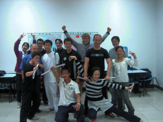 简单的介绍之后,留学生们已经按捺不住想要亲身体验学习的心情。狂龙武协的四位教练开始了一对一的传授指导。蒙古留学生莎丽洁小试牛刀,身段标准;一位来自吉尔吉斯斯坦的留学生天资极好,要领得法,把双截棍耍得有模有样的;来自德国、英国的留学生则是在一旁与中国学生交流中国武术的精髓。最后,留学生们向教练行了谢师礼,以表示感谢。