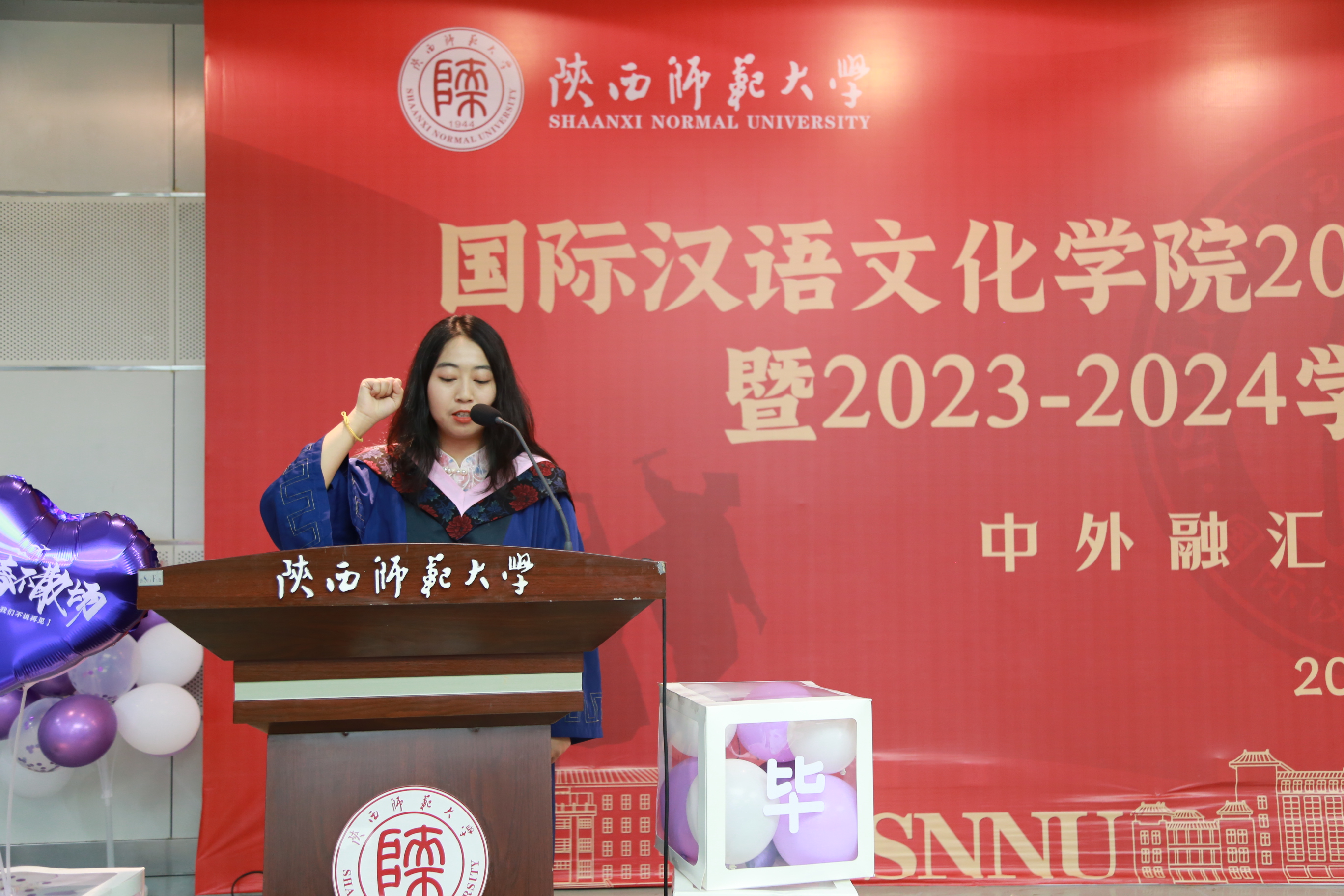 2024届毕业生,我自愿践行‘厚德 积学 励志 敦行’的校训精神,传承‘中外融汇 知行合一’的院训精神,牢记母校的培养之恩、铭记师长的教诲之情、感念同学的帮助之谊。我将始终保持热爱与追求,弘扬中华传统文化,推进中外文化交流互鉴,以善良之心回报祖国、以真诚之态服务社会、以勤奋之姿追求梦想、以勇敢之魄担当责任,争做新时代有为青年。”誓言铮铮,展现了国汉学子的坚定信念和决心。相信在未来的日子里,他们会牢记这份誓言,以更加饱满的热情和更加坚定的步伐,走向人生新的征程。