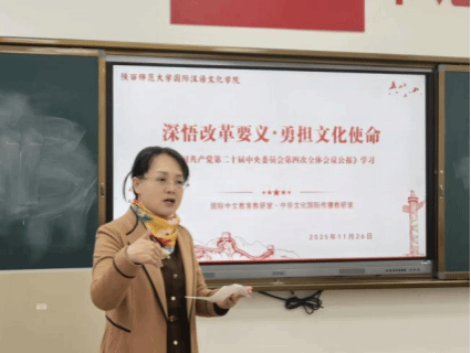 工作紧密相关的部署展开热议。老师们结合国际中文教学中的教学改革、跨文化课堂实践、留学生文化活动等工作实际交流感悟。大家一致认为,全会提出的文化强国建设要求,为国际中文教育和中华文化国际传播工作指明了方向,作为一线教师,需将全会精神融入教学创新,助力中华文化更好走向世界。