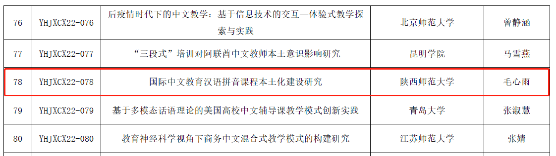 研究生毛心雨申报的《国际中文教育汉语拼音课程本土化建设研究》项目成功立项,获批资助经费2万元。该级别项目为博彩体育