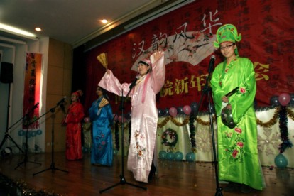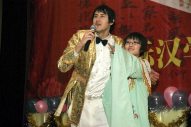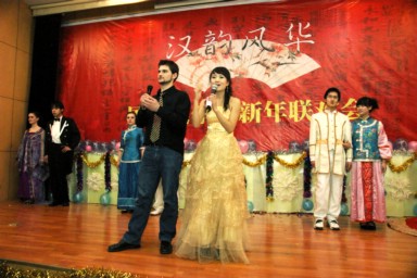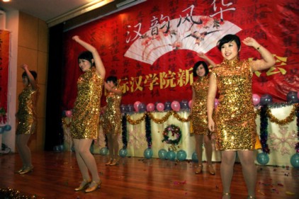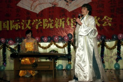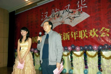 2007级对外汉语专业带来的《shining kiss》拉开了新年联欢会的序幕。活力青春、古灵精怪的动感舞姿,瞬时吸引了全场观众的目光。颇具创意的歌舞剧《罗密欧与林黛玉的爱情奏鸣曲》,既跨越了历史时空,又拉近了中西文化的距离。妙语连珠的相声,极具风雅的古诗文配乐朗诵、中外硕士研究生用歌舞演绎的《中国话》以及有“钢琴王子”之称的韩国留学生郑荣光、李起京带来的钢琴伴唱,为晚会增色不少!