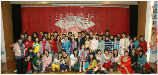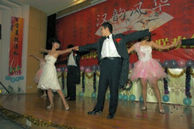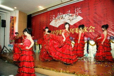 青年教师与来自各国的留学生合唱了《橄榄树》和《北京欢迎你》,蕴含着对同学们的期许和祝福。“五洲汉儒”国际文化交流协会的中外学生共同演绎的歌曲串烧《我们的歌》更是精彩绝伦,激扬与优雅交错、高亢与舒缓并存,观众的欢呼声、赞叹声也伴随着旋律此起彼伏。2006级对外汉语的三句半表演《四大才子话师大》,贴合校园生活实际,语段诙谐幽默,掌声爆笑声迭起,将本次晚会推向了高潮。2007级对外汉语的红叶子合唱团为观众带来了探戈曲风的原创作品,展现了同学们独特的创作才华和对异域文化的领悟力,将晚会的气氛推向又一个顶点。在华丽而优雅的华尔兹服装秀中,联欢会进入了尾声。那些雍容华贵的汉服,那些英姿帅气的王子装,那些流动的光影以及每一个人脸上灿烂的笑容,共同铸就了此次晚会的成功。